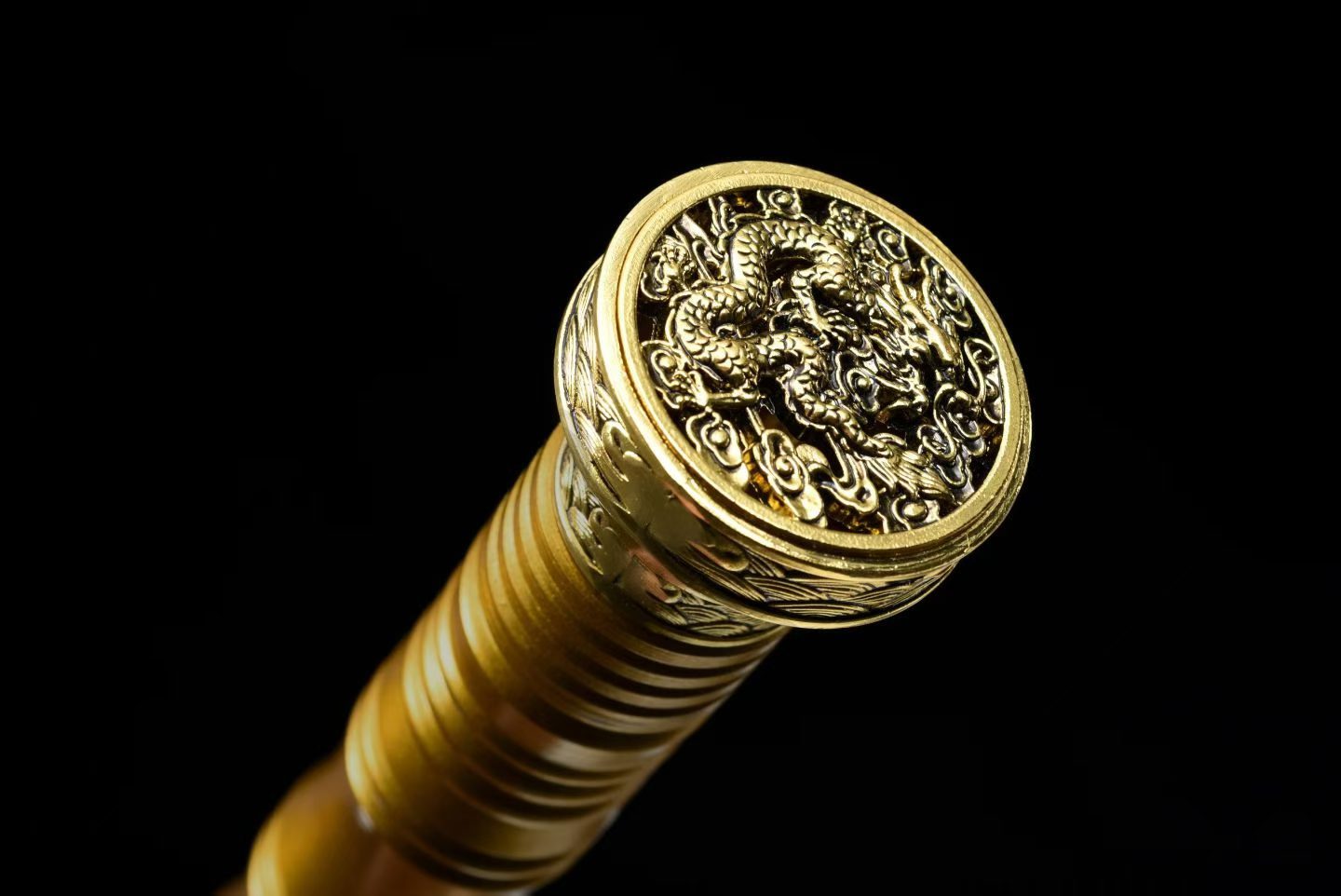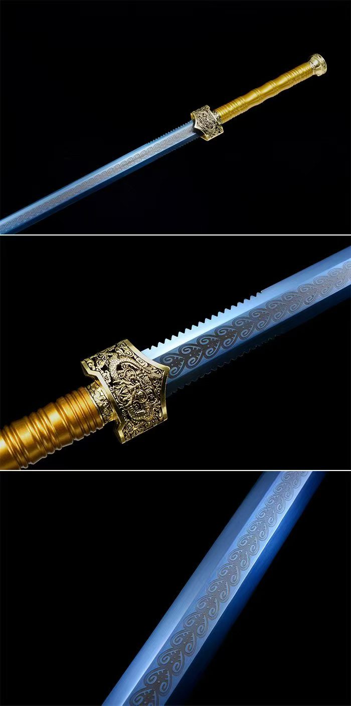 Lưỡi được chế tác từ thép mangan cao cấp, xử lý bề mặt khắc hoa và phủ xanh nhiệt (blued finish), đạt độ cứng khoảng 60 HRC, tăng độ bền và tính thẩm mỹ. Bao kiếm làm từ gỗ mun cao cấp, kết hợp tay cầm kim loại sơn tĩnh điện và phụ kiện hợp kim mạ vàng sang trọng.