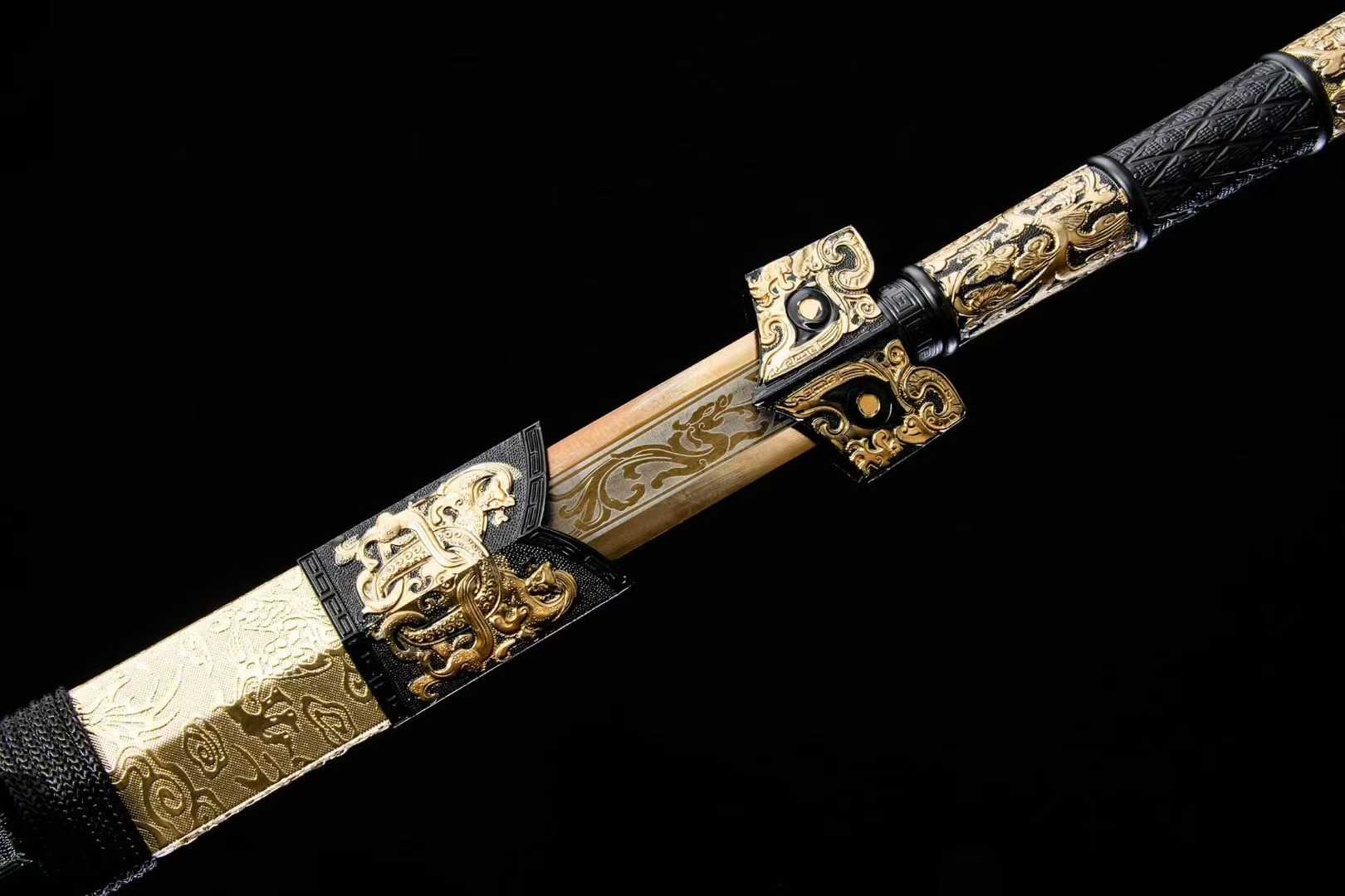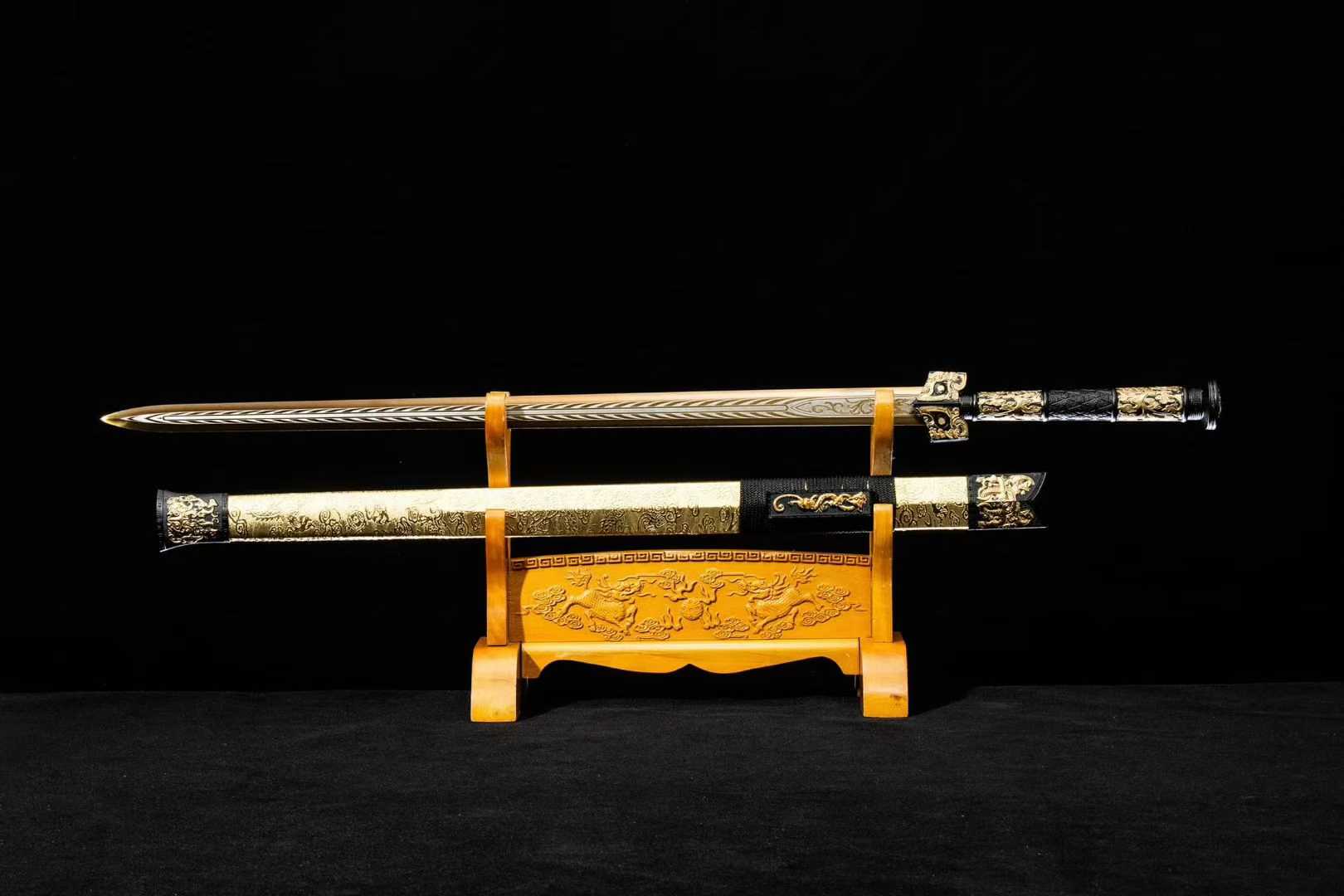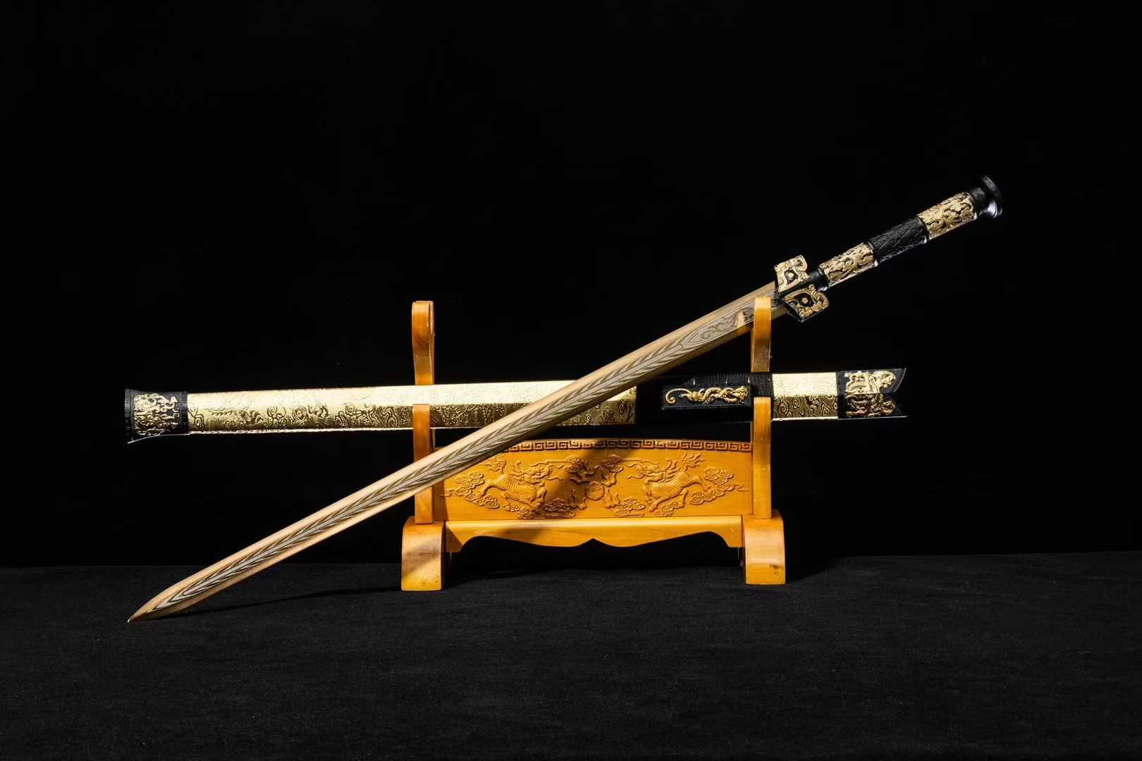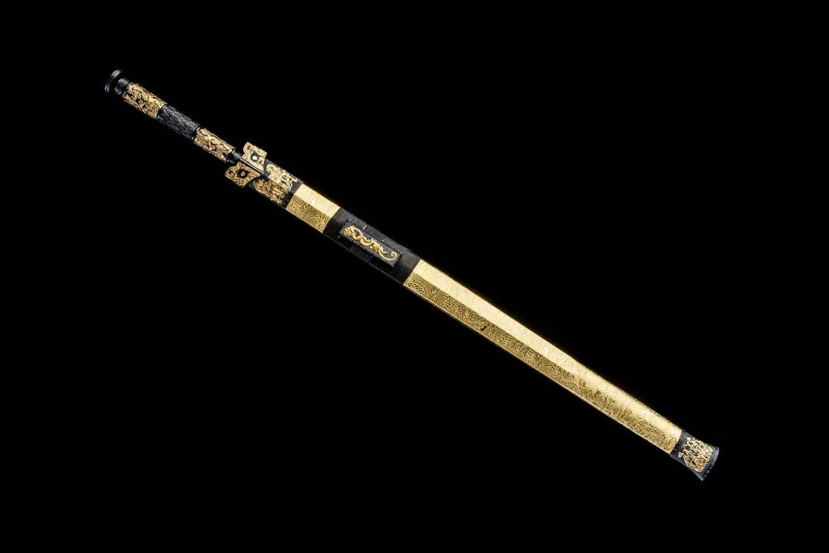 Thanh kiếm Hán Miêu Kim gây ấn tượng với thiết kế hoa văn mạ vàng cổ điển (描金), tái hiện vẻ đẹp vương giả của kiếm khí Trung Hoa thời cổ. Sử dụng thép mangan hiệu suất cao, vỏ bọc da sang trọng, đây là lựa chọn lý tưởng cho người sưu tầm, trưng bày hoặc làm quà tặng cao cấp.