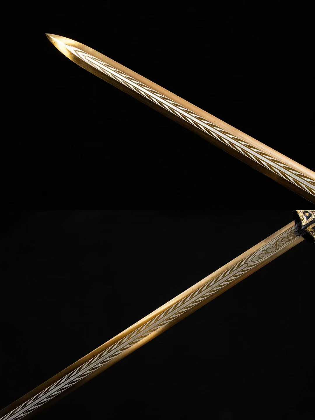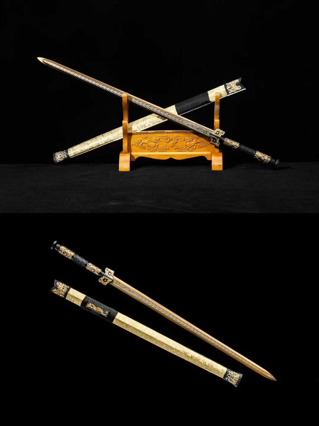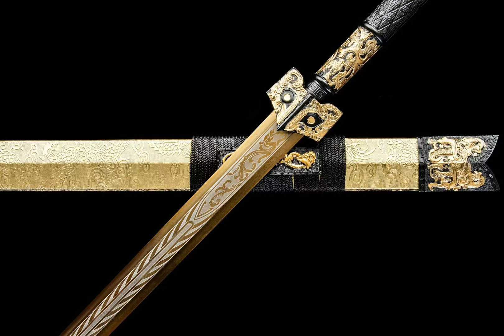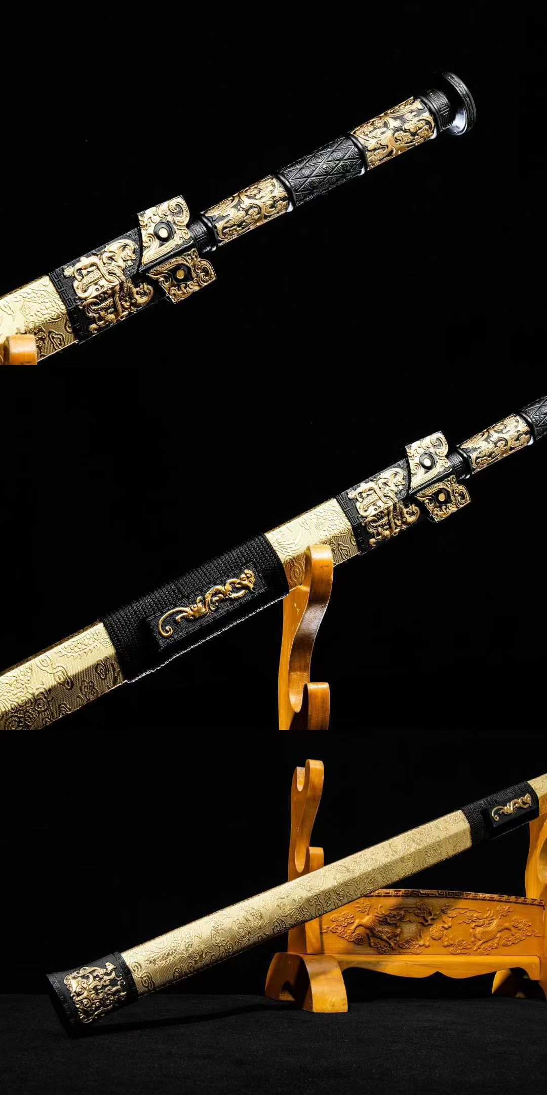 Thanh kiếm Hán Miêu Kim gây ấn tượng với thiết kế hoa văn mạ vàng cổ điển (描金), tái hiện vẻ đẹp vương giả của kiếm khí Trung Hoa thời cổ. Sử dụng thép mangan hiệu suất cao, vỏ bọc da sang trọng, đây là lựa chọn lý tưởng cho người sưu tầm, trưng bày hoặc làm quà tặng cao cấp.