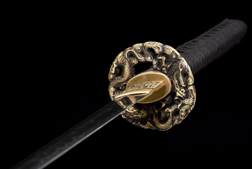 Kiếm Nhật katana Long Tước – T10 Tôi Đất, Mài Gương | Đồng Khắc Thủ Công, Vỏ Gỗ Quấn Mây Sơn Mài Cao Cấp