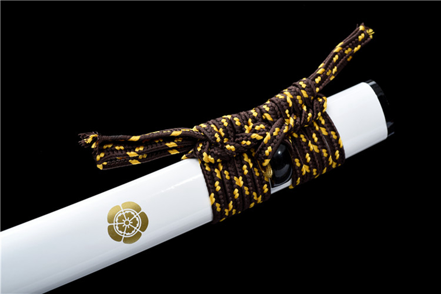 Vỏ kiếm: Làm từ gỗ tự nhiên, sơn mài cao cấp, trang trí huy hiệu gia đình truyền đời sắc nét, kèm dây quấn tay cầm thô dày đẹp mắt.