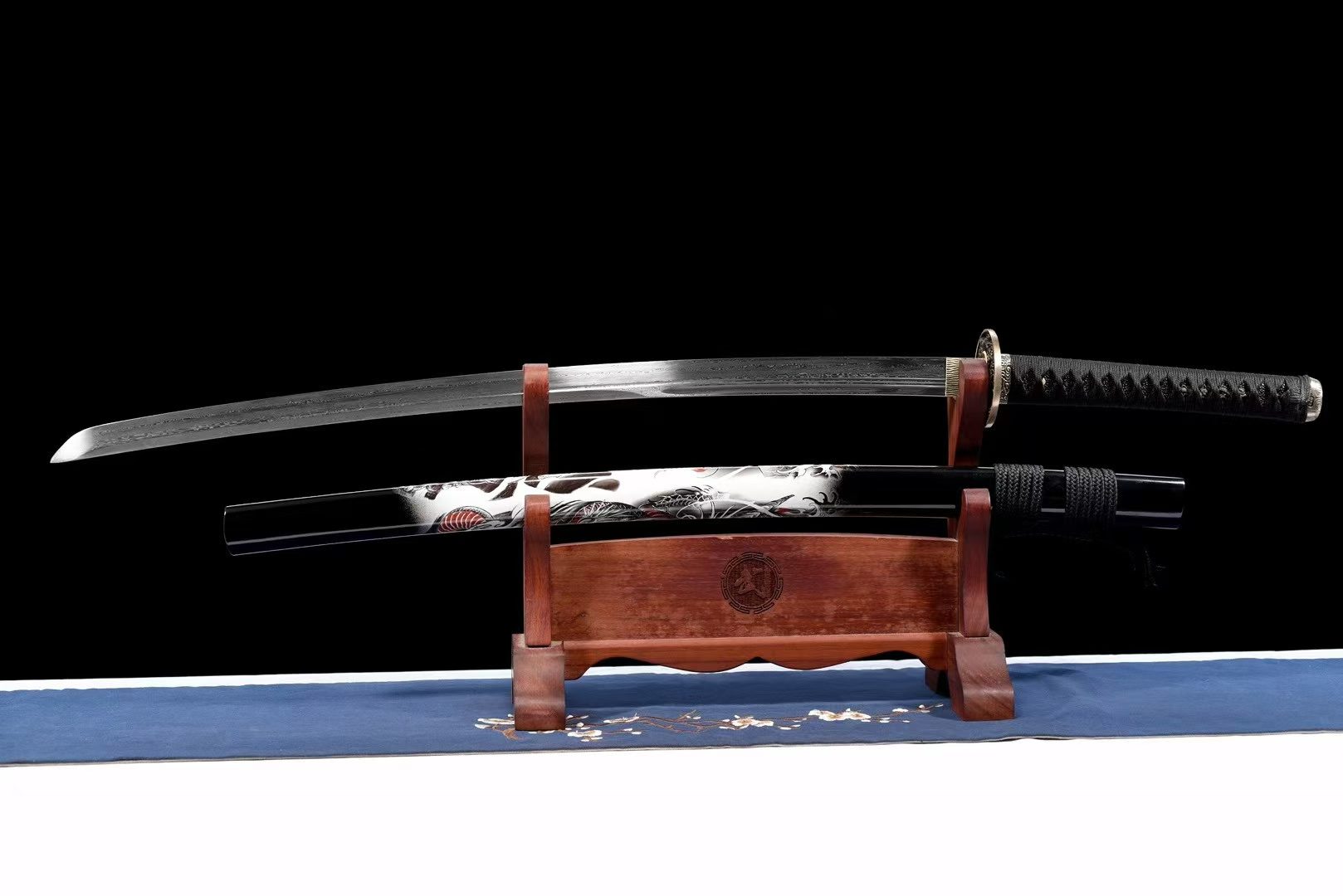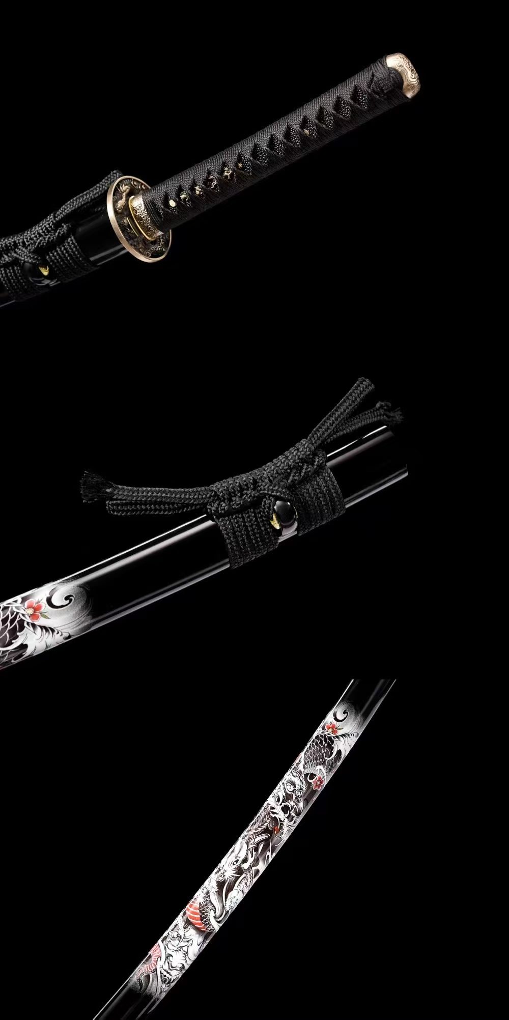 - Vỏ kiếm (Saya): Gỗ tự nhiên sơn mài, trang trí họa tiết thủ công