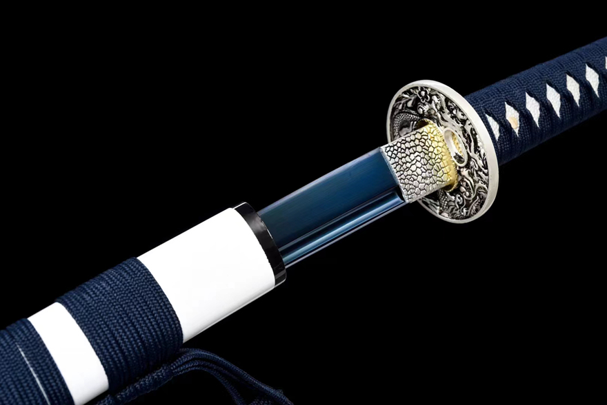 Chất liệu lưỡi: Lưỡi kiếm được làm từ thép carbon cao cấp (50# steel) qua quá trình rèn thủ công, mang lại độ sắc bén và bền bỉ cao. Lưỡi kiếm sau đó được sơn mạ xanh và khắc họa tiết tinh xảo, tạo nên một sản phẩm không chỉ mạnh mẽ mà còn rất ấn tượng về mặt thẩm mỹ.