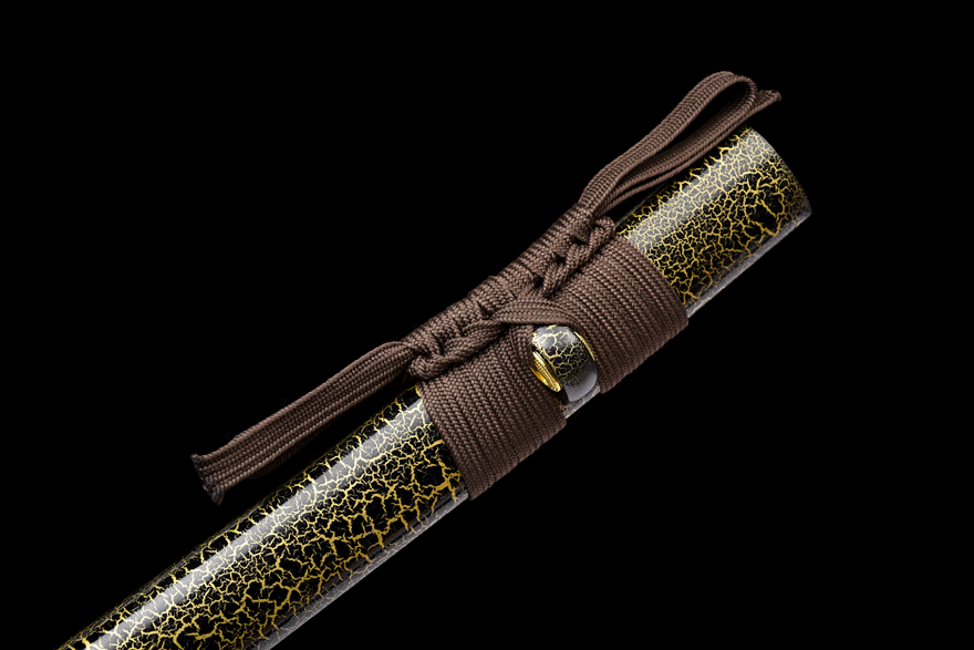 Vỏ kiếm làm từ gỗ thật phủ sơn mài có vân băng, tạo nét độc đáo, sang trọng