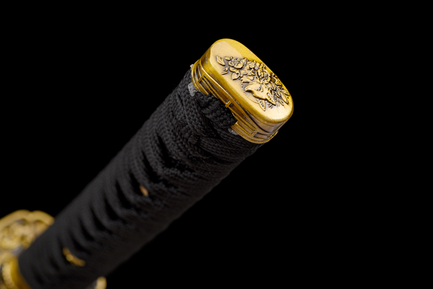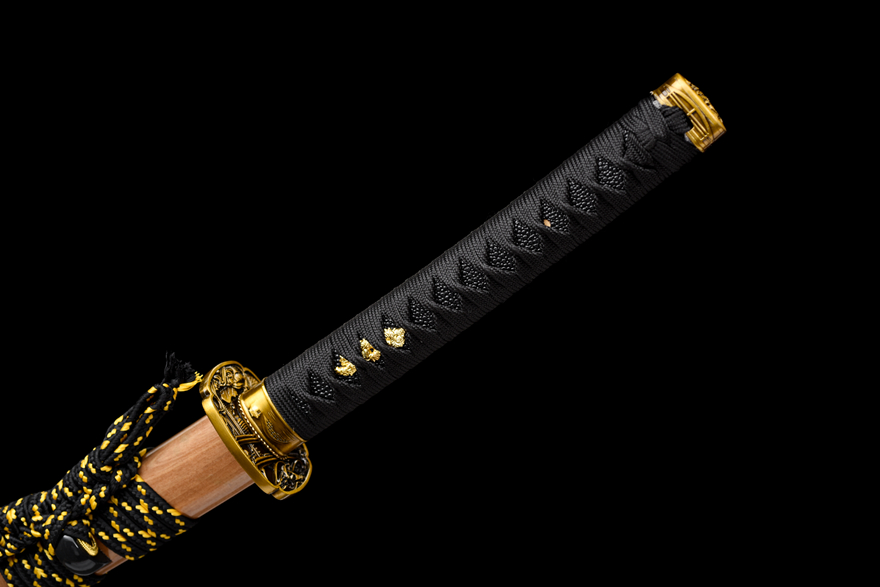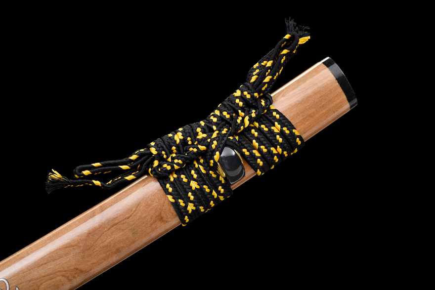 Cán kiếm làm từ gỗ tự nhiên quấn dây chắc chắn, đi kèm dây đeo "Kim Bì Hạ Tục" (dây tua màu vàng ánh kim sang trọng). -