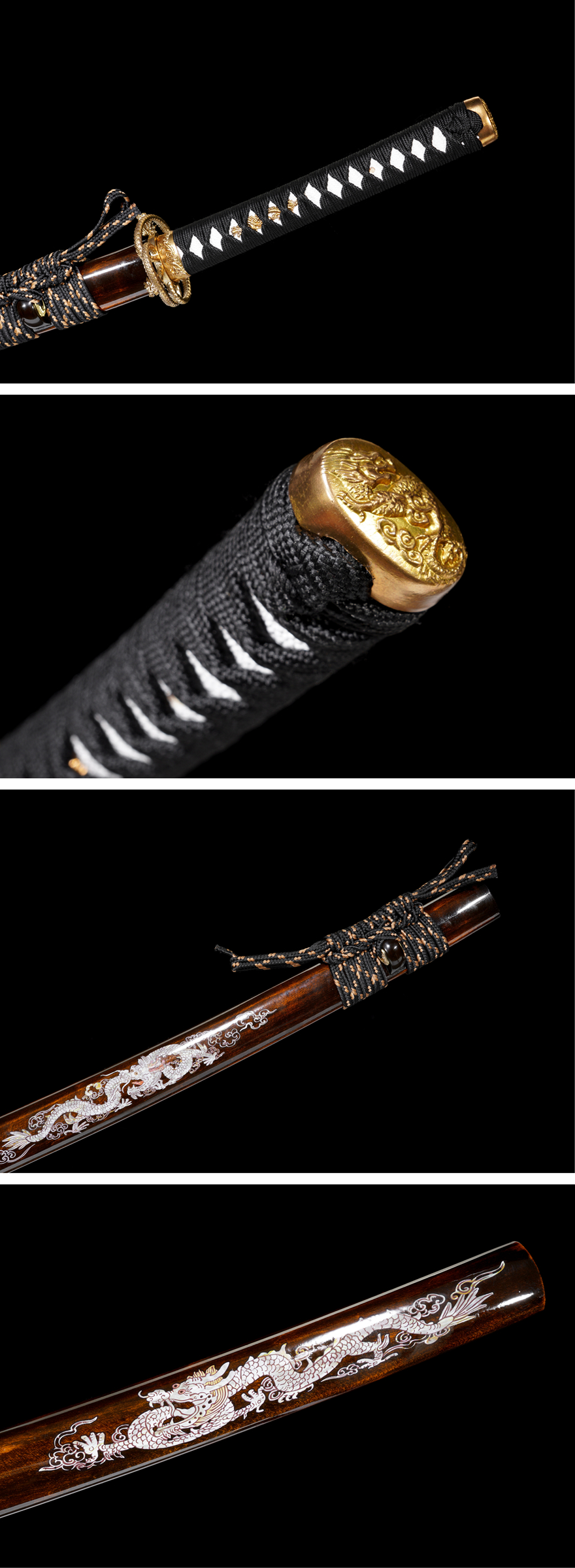 Trang trí: Bộ trang trí kiếm (koshirae) được chế tác từ đồng nguyên chất, khắc họa chi tiết tinh xảo, tạo nên một tổng thể hoàn hảo, hài hòa giữa tính thẩm mỹ và tính thực dụng của kiếm.