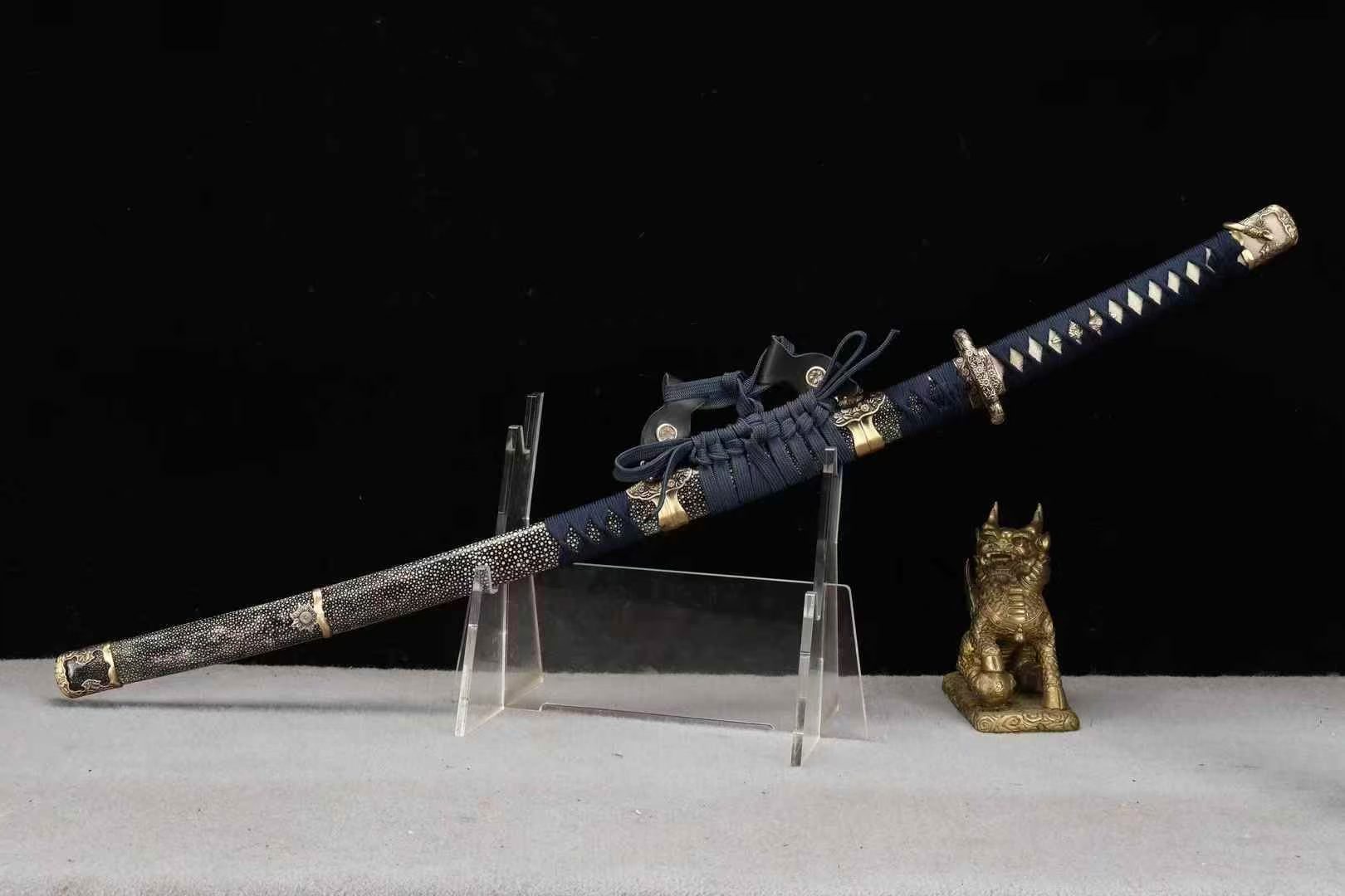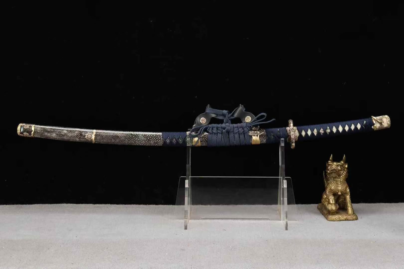 Kiếm Nhật Tachi Ô Từ Damascus 26 Inch – Thép Đại Mã Ô Từ, Phủ Đất Tôi Lưỡi, Da Cá Đuối Cao Cấp
