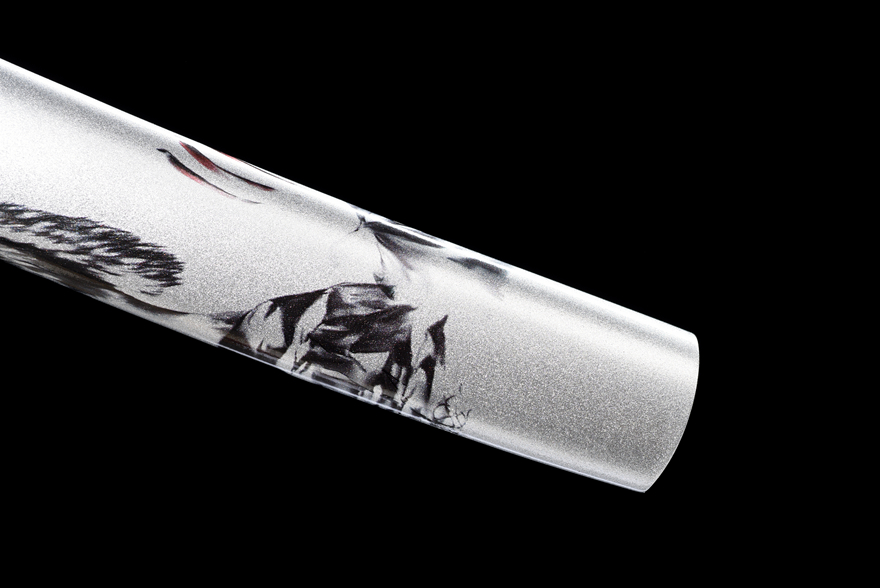 Vỏ kiếm bằng gỗ sơn mài cao cấp, được vẽ tay họa tiết "Huyết Lang" sống động, thể hiện tinh thần chiến binh và ý chí không khuất phục.