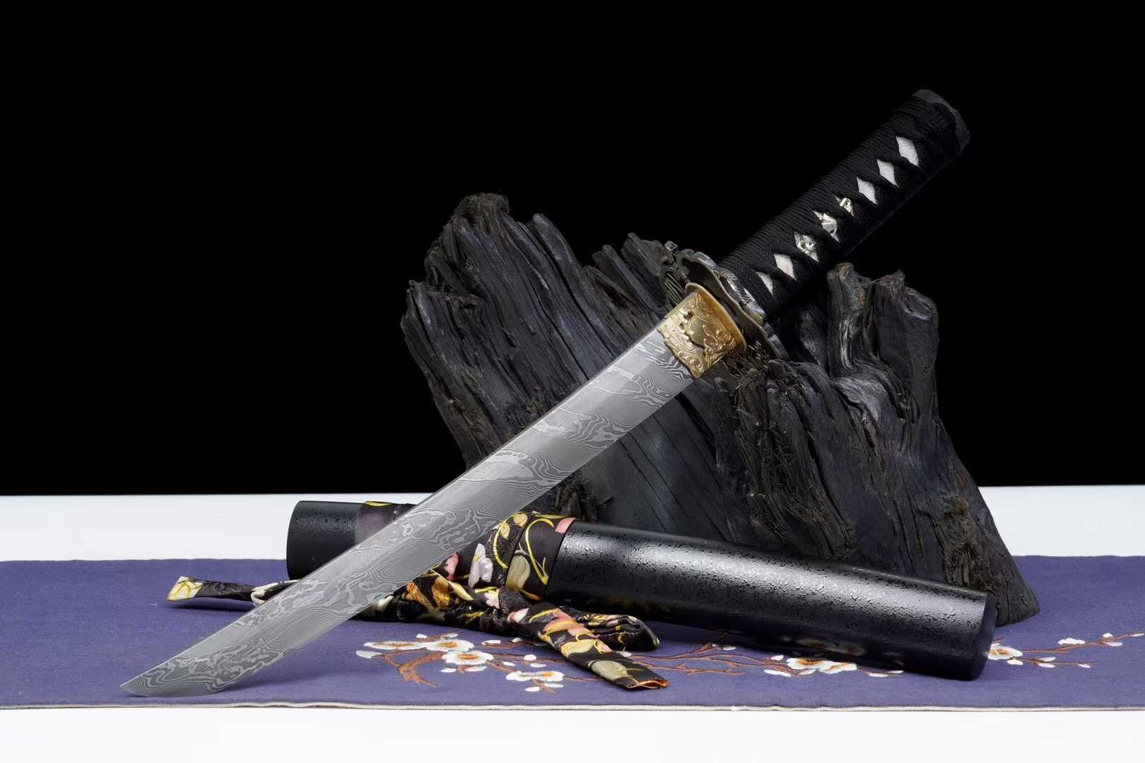 Thanh Đao Ngắn Mê Tiên được chế tác từ thép hoa văn gập xoắn (twist pattern Damascus steel) qua hàng nghìn lần rèn luyện thủ công, sở hữu độ cứng vượt trội và độ bền tuyệt hảo. Đây là lựa chọn hoàn hảo cho sưu tập và sử dụng chuyên nghiệp.