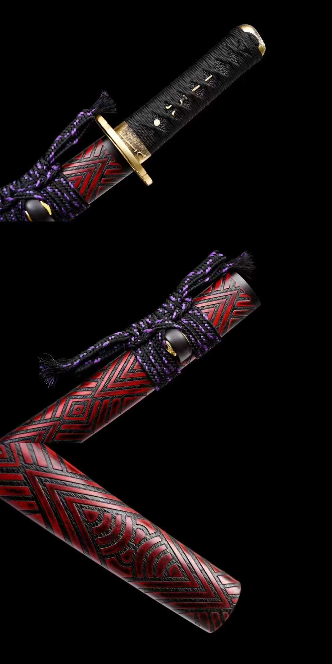 Chất liệu vỏ kiếm: Gỗ tự nhiên, phủ sơn mài và khắc hoa văn độc đáo, kết hợp với dây buộc thô đẹp mắt, tạo sự sang trọng và chắc chắn.