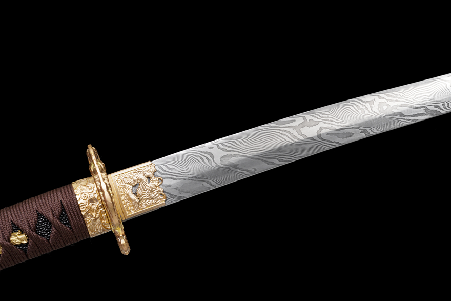 Lưỡi kiếm: Rèn thủ công từ thép hoa văn gấp lớp (tự luyện), tạo vân Damascus xoắn (大马纹) độc đáo.