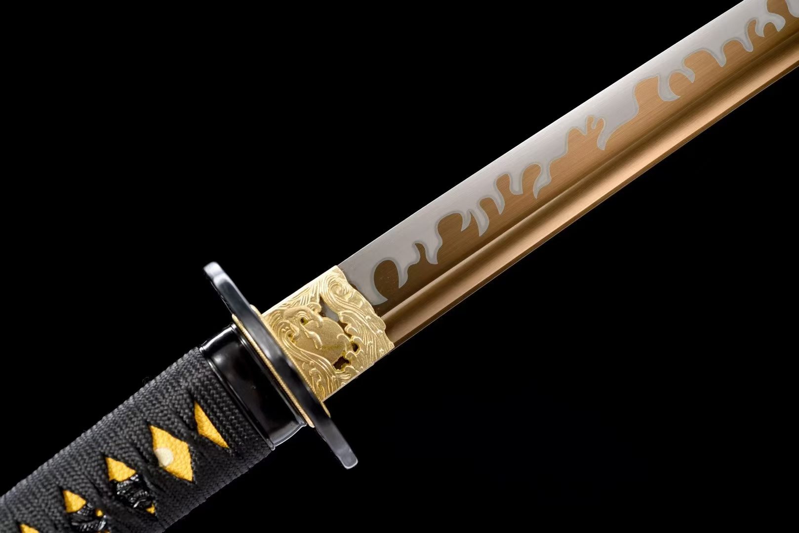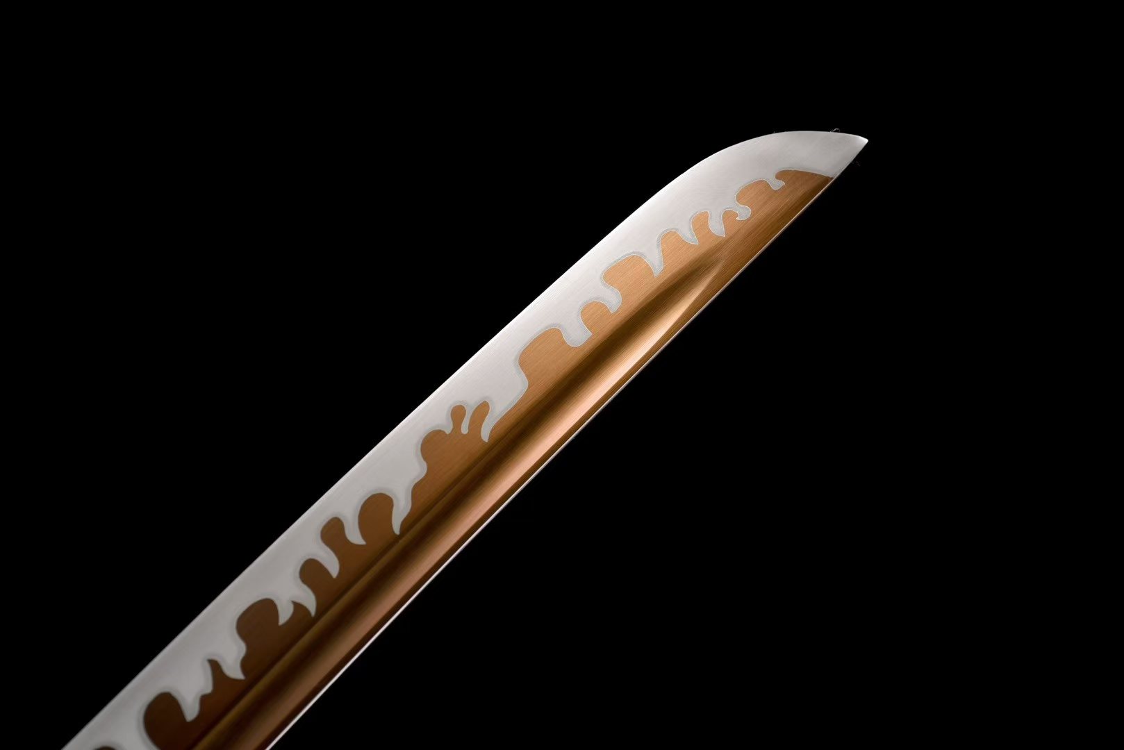 Lưỡi dao được rèn từ thép mangan cao cấp, có khả năng uốn cong 90 độ không biến dạng, đảm bảo độ bền vượt trội. Thân dao được xử lý bằng công nghệ mạ vàng (烤金), kết hợp mài thủ công hoàn toàn với vân lửa kép (推磨研白双线火焰纹), tạo nên vẻ ngoài nổi bật và sắc bén. Độ cứng đạt 60 HRC, giúp chặt kim loại không sứt mẻ lưỡi.