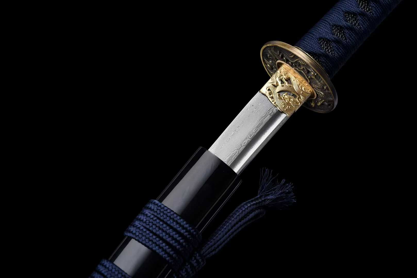 “Thanh Long Hiếp Sai” (青龙肋差) là mẫu kiếm Nhật ngắn (Wakizashi) hiệu năng cao, được rèn thủ công hoàn toàn bằng thép hoa văn bách luyện – dòng thép truyền thống nổi tiếng với độ cứng, độ đàn hồi và hoa văn tự nhiên tuyệt đẹp trên thân lưỡi.