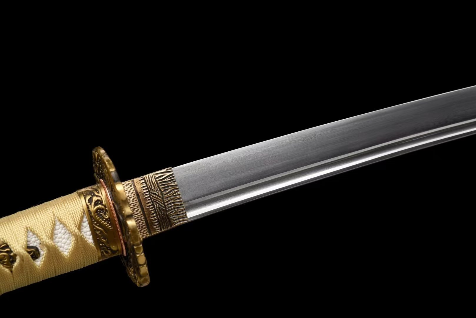 - Lưỡi kiếm: Thép hoa văn bách luyện, vân gấp tự nhiên