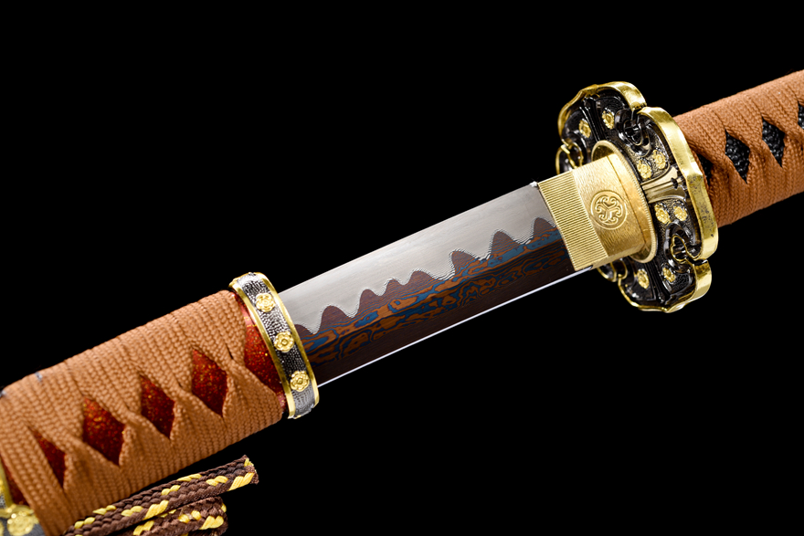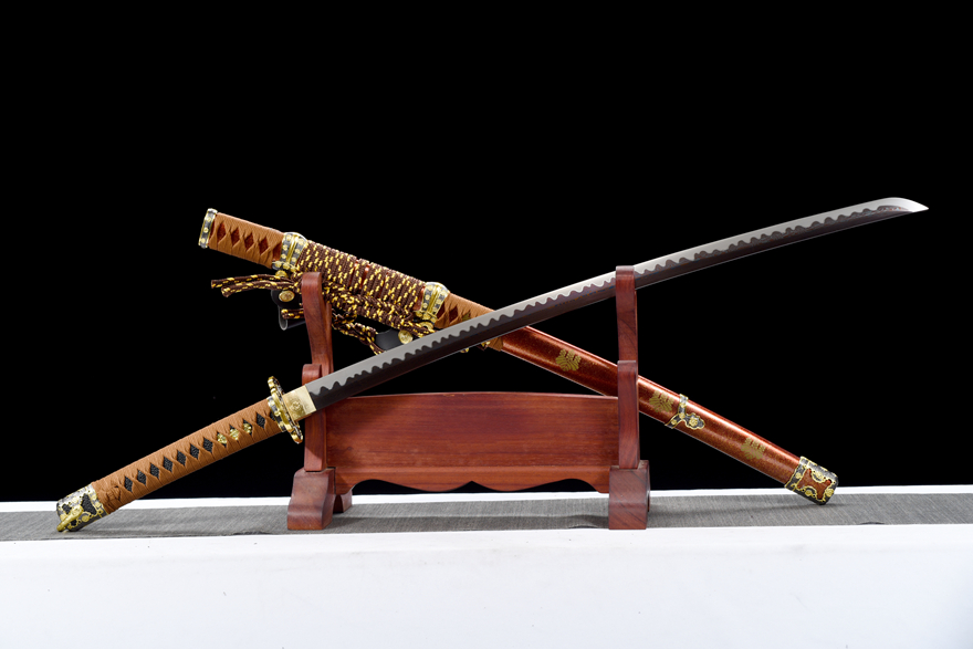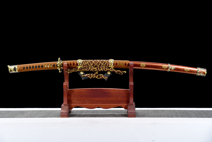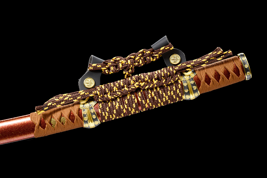 Vỏ kiếm làm từ gỗ sơn mài đỏ ánh vàng cao cấp (红洒金大漆鞘), kết hợp với dây quấn cán thô tinh tế (粗下绪) tạo nên nét sang trọng và đậm chất truyền thống Nhật Bản.