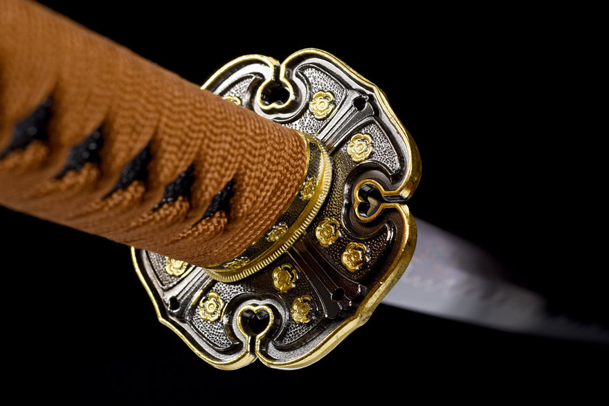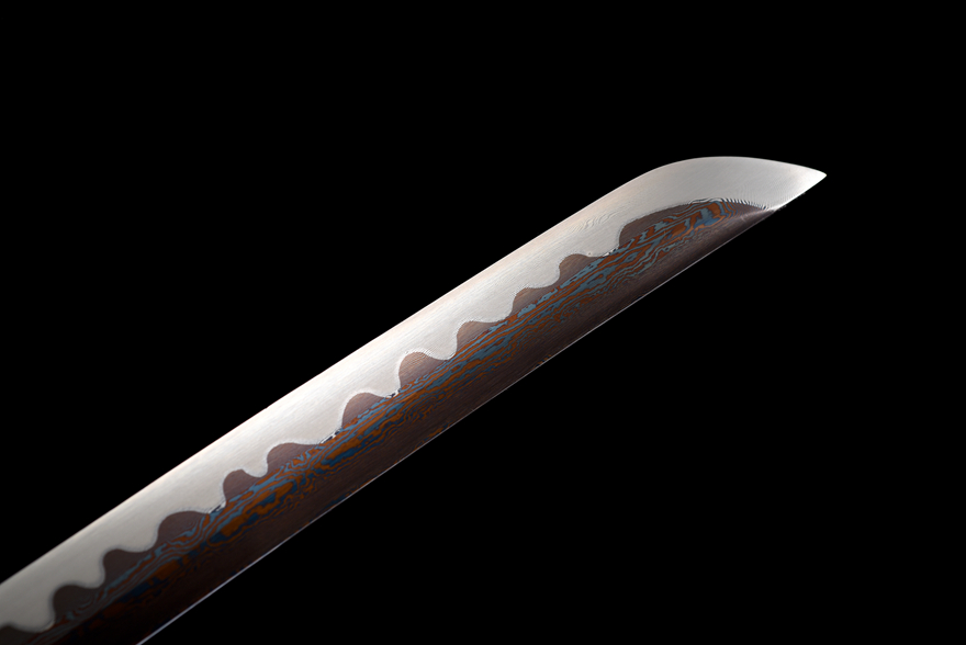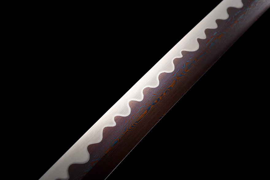 Kiếm samurai được chế tác từ thép hoa văn luyện nhiều lần (百炼钢), trải qua kỹ thuật rèn đập tinh xảo. Lưỡi kiếm xử lý theo công nghệ nướng xanh (烤蓝工艺) giúp tăng độ bền và chống gỉ hiệu quả. Đặc biệt, phần lưỡi được mài tay thủ công theo kỹ thuật đẩy mài trắng với đường đôi (推磨研白双线), tạo nên vẻ sắc nét và bền chắc tối ưu.