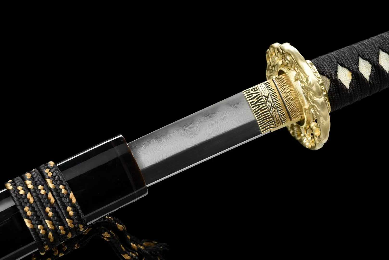 Vỏ kiếm: Gỗ thanh bì cao cấp phủ sơn mài đen, đầu vỏ nạm sừng trâu – thiết kế koi-guchi, kurigata, kojiri chuẩn Nhật