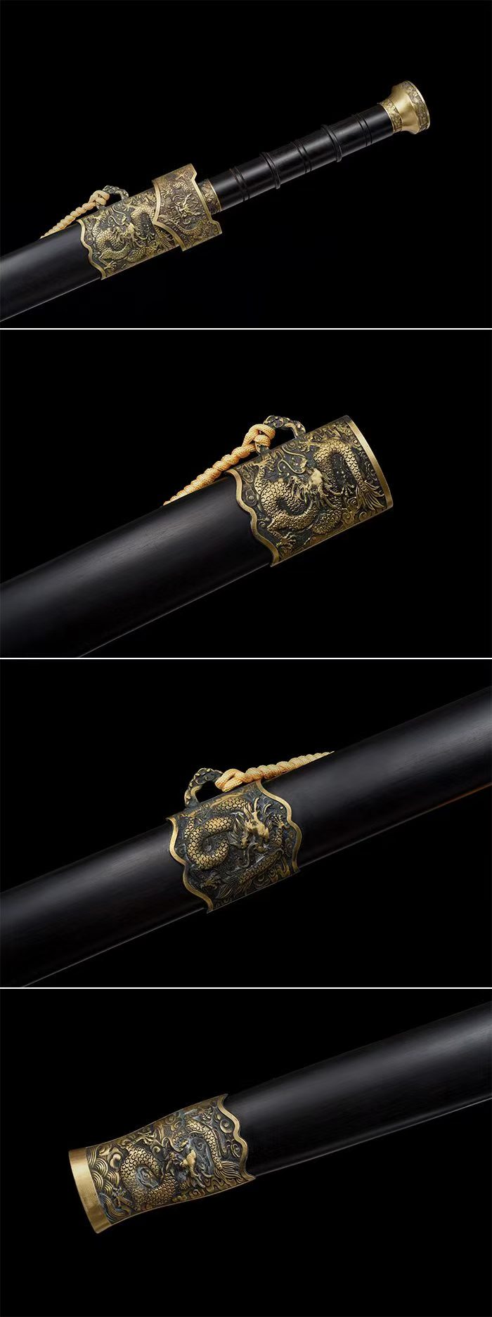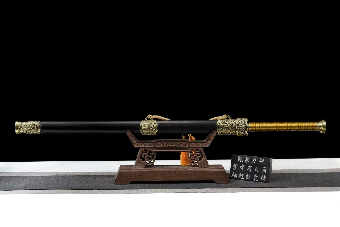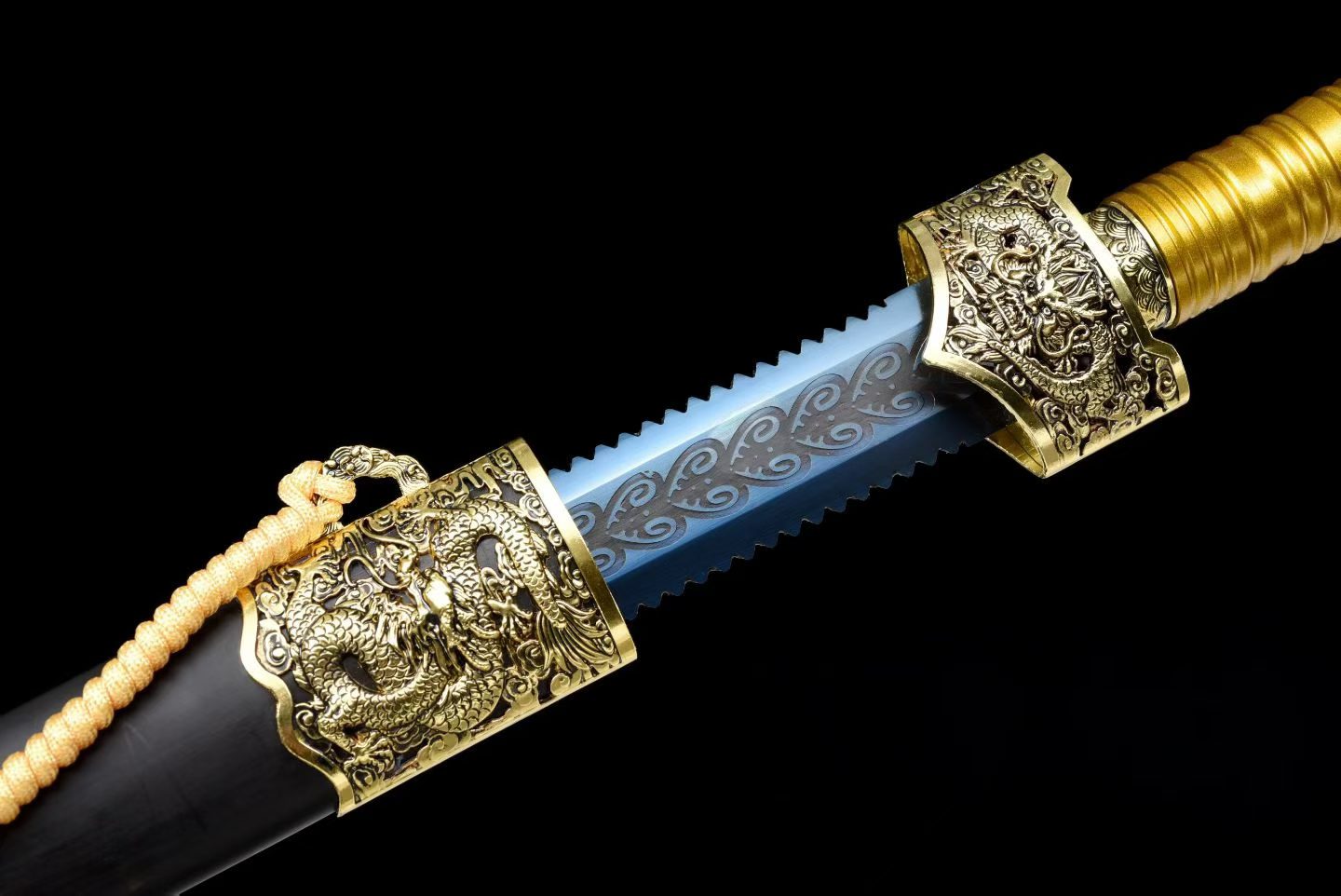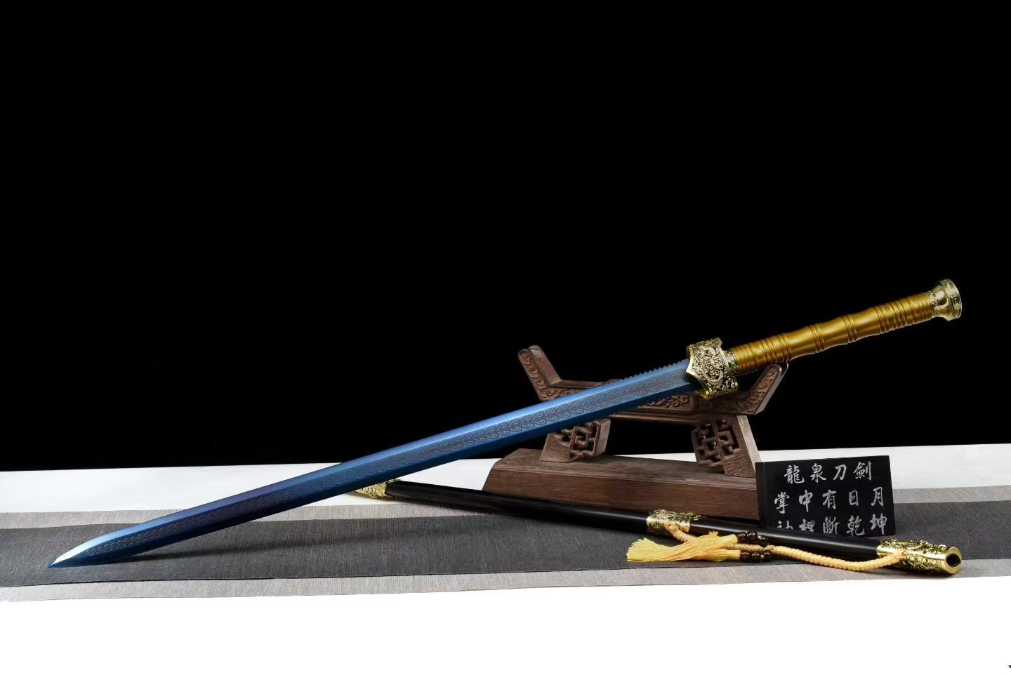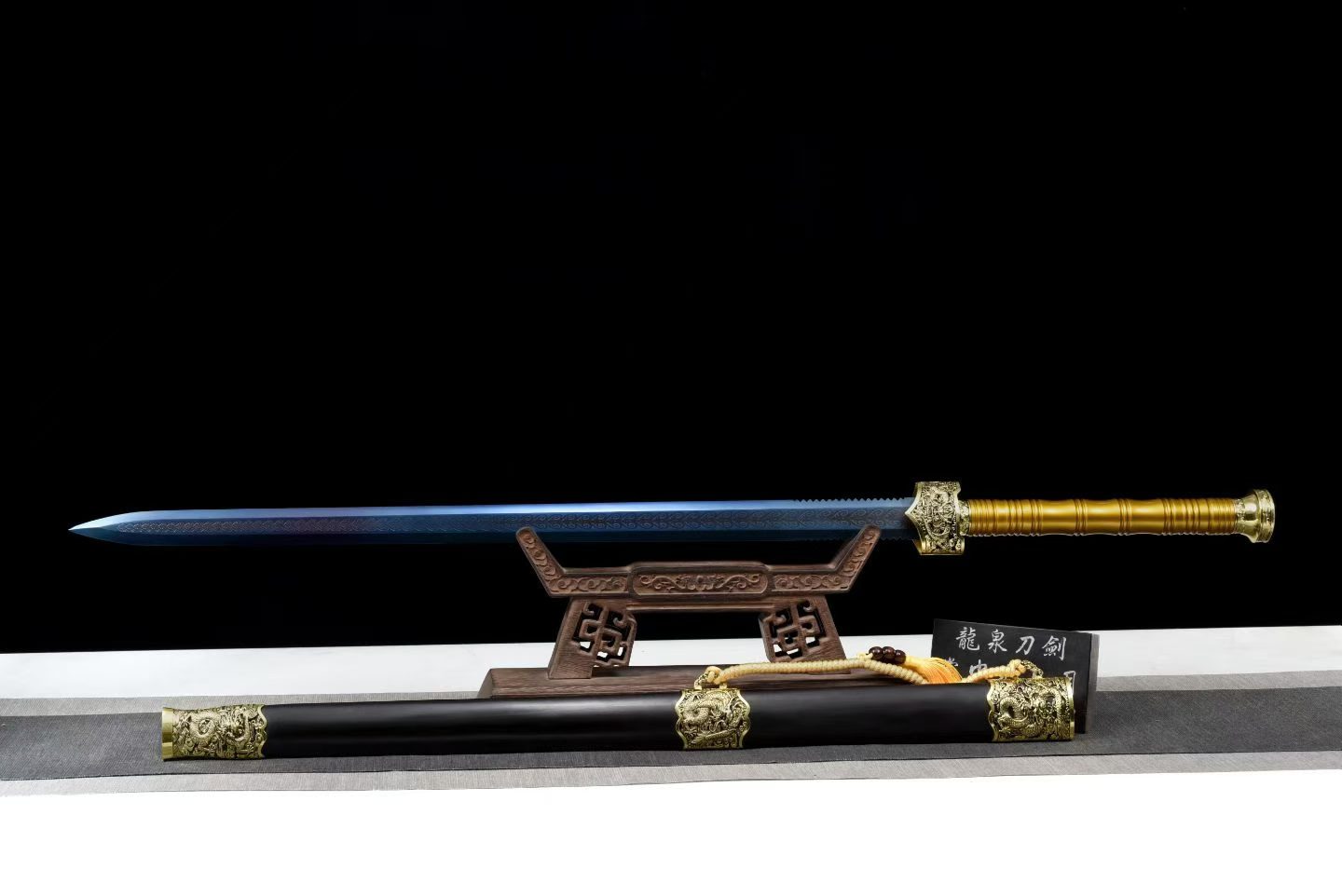 Lưỡi được chế tác từ thép mangan cao cấp, xử lý bề mặt khắc hoa và phủ xanh nhiệt (blued finish), đạt độ cứng khoảng 60 HRC, tăng độ bền và tính thẩm mỹ. Bao kiếm làm từ gỗ mun cao cấp, kết hợp tay cầm kim loại sơn tĩnh điện và phụ kiện hợp kim mạ vàng sang trọng.