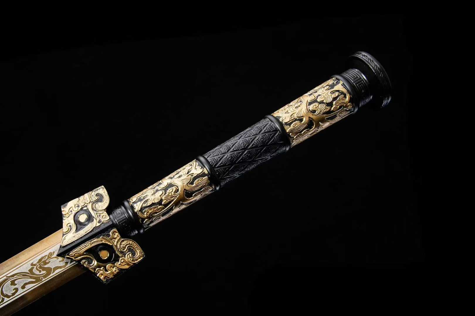 Thanh kiếm Hán Miêu Kim gây ấn tượng với thiết kế hoa văn mạ vàng cổ điển (描金), tái hiện vẻ đẹp vương giả của kiếm khí Trung Hoa thời cổ. Sử dụng thép mangan hiệu suất cao, vỏ bọc da sang trọng, đây là lựa chọn lý tưởng cho người sưu tầm, trưng bày hoặc làm quà tặng cao cấp.