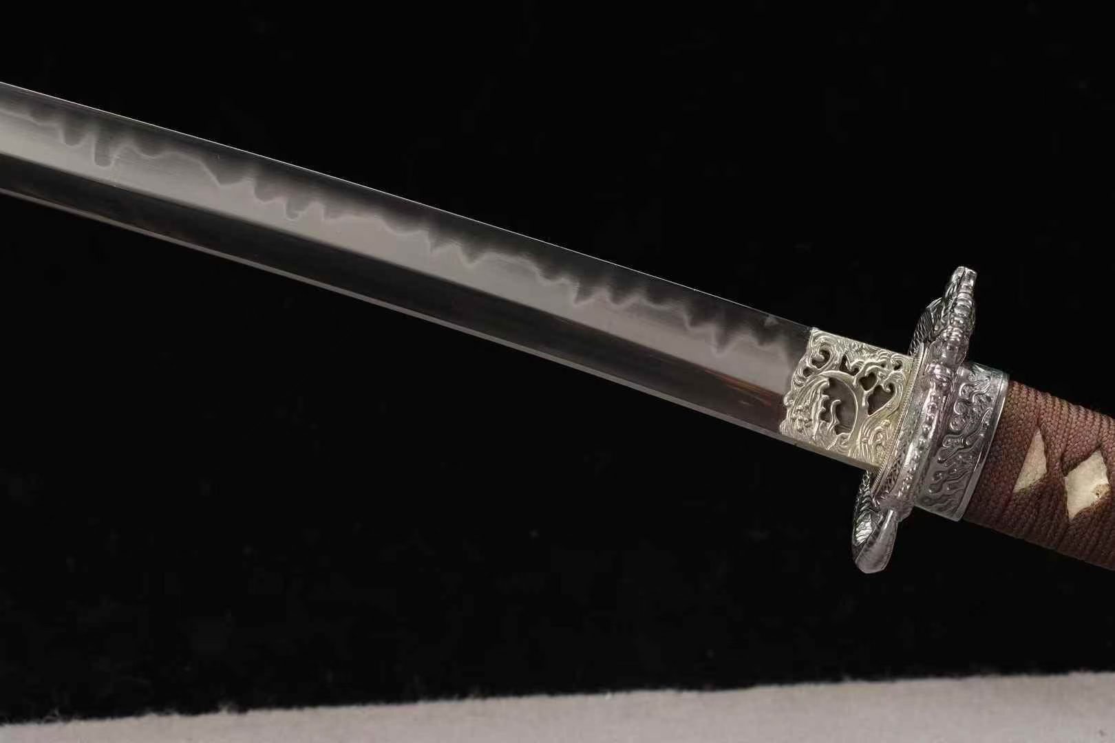 Kiếm Katana Nhất Niệm Võ Sĩ 26 inch được rèn từ thép carbon công cụ T10 cao cấp, cho độ cứng cao và độ dẻo dai vượt trội. Lưỡi áp dụng kỹ thuật phủ đất tôi lưỡi truyền thống, kết hợp quy trình mài nền cơ bản và mài hoàn thiện phong cách Nhật Bản, tạo hiệu ứng vân sóng nước trắng rõ nét, bề mặt sáng sạch, hiệu ứng phản quang mạnh, tăng giá trị thẩm mỹ khi trưng bày.