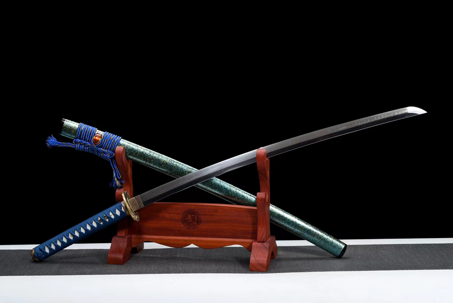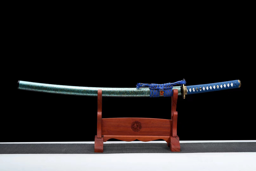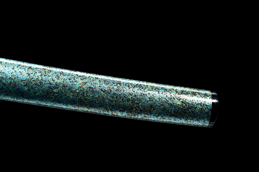 Vỏ kiếm làm từ gỗ tự nhiên sơn chấm (点漆) – nước sơn bền, hoa văn lấp lánh tinh tế.