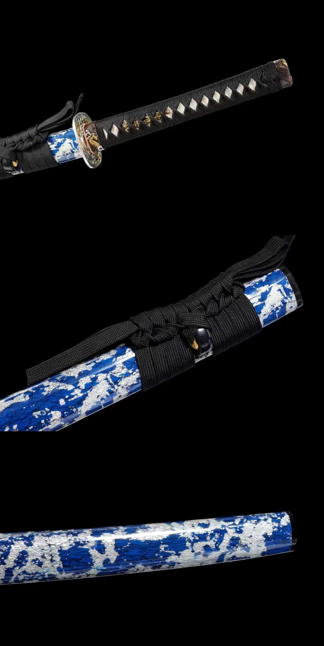 Bộ phụ kiện (koshirae) dùng đồng nguyên chất mạ vàng & bạc, chạm khắc thủ công tinh xảo. Tay cầm bọc da cá đuối thật, vỏ kiếm làm từ gỗ xanh bọc da thô trang trí bạc lá, miệng vỏ (鲤口), chắn tay (挡) và đuôi vỏ (栗形) được khảm sừng trâu – tổng thể đạt đến đỉnh cao của sự tinh mỹ.