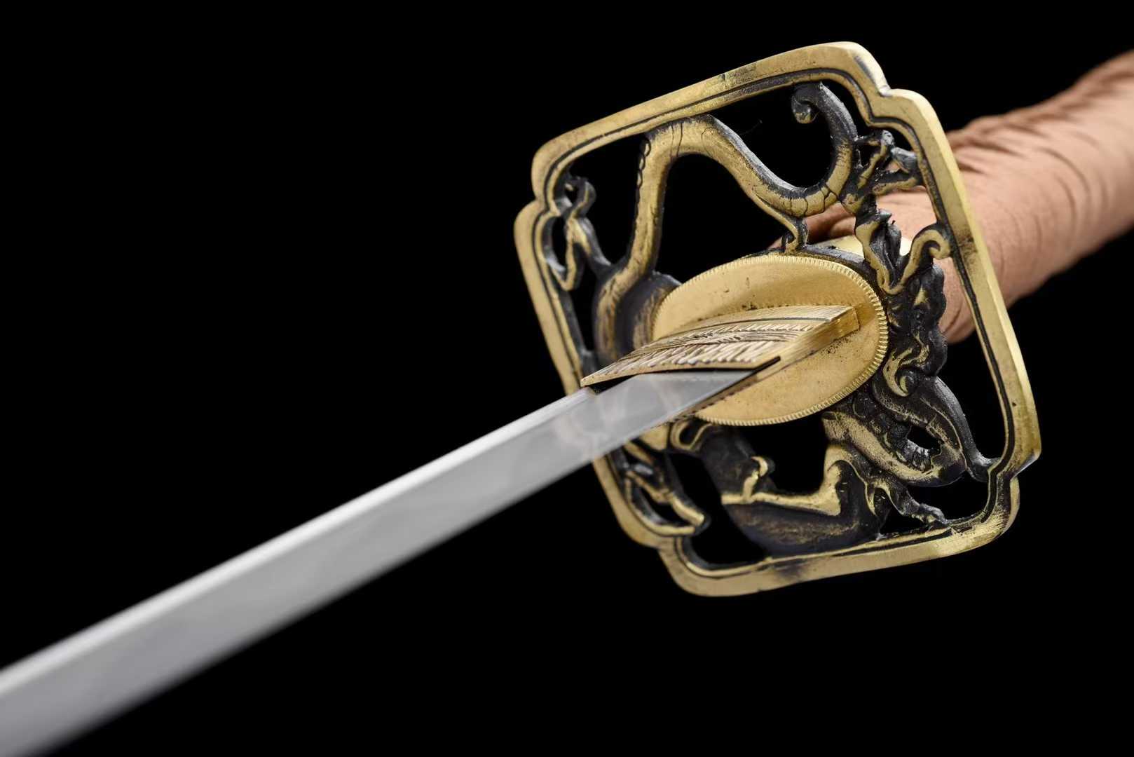 Phụ kiện làm bằng đồng nguyên chất, điêu khắc tinh xảo, tạo điểm nhấn cao cấp cho toàn bộ thanh kiếm.
