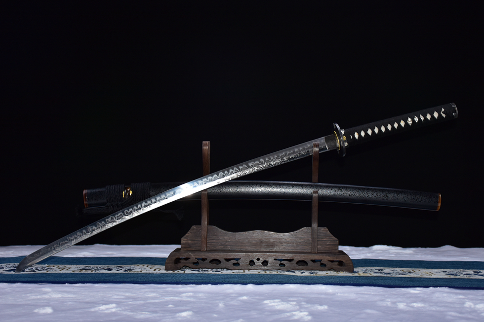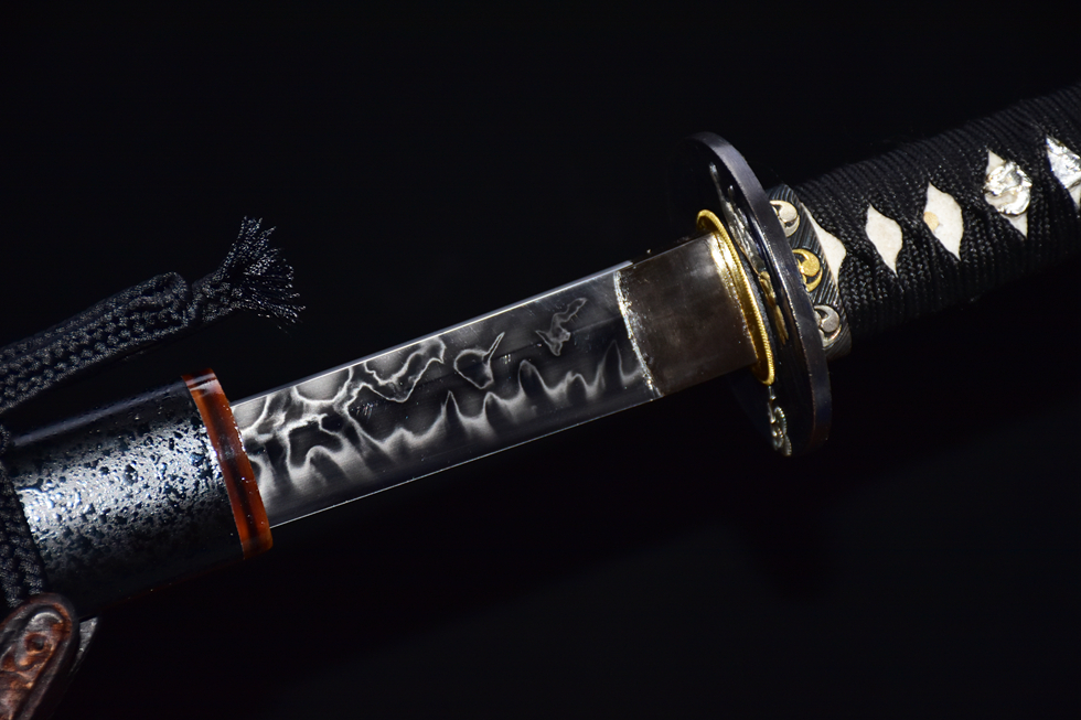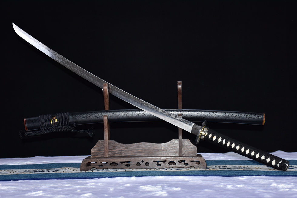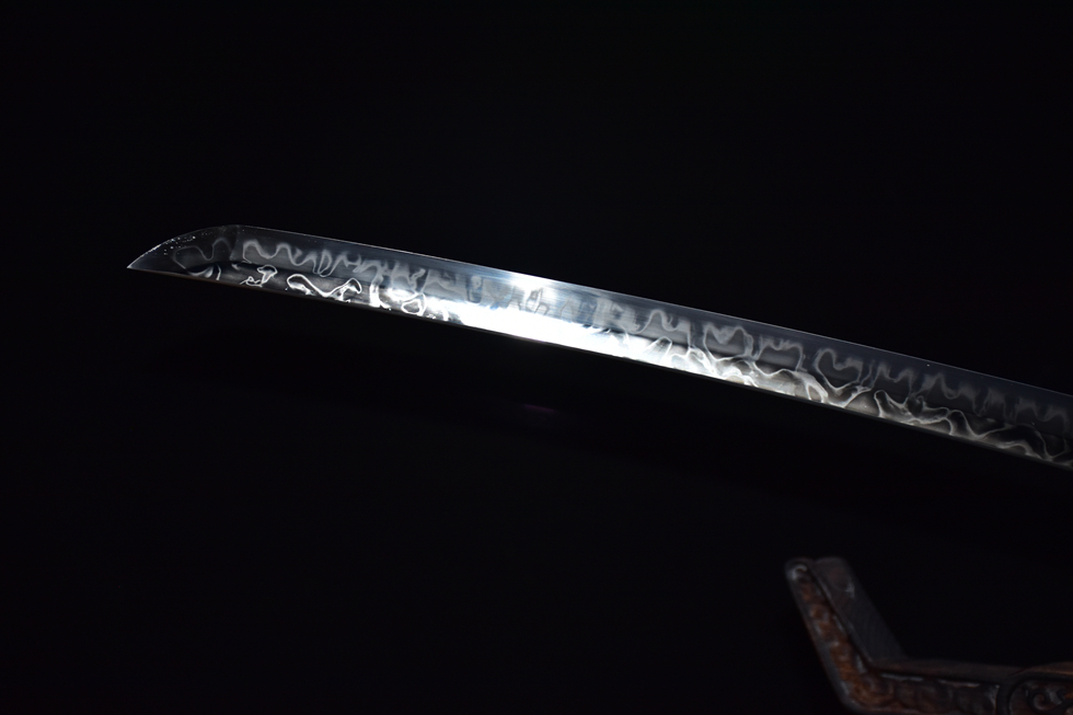 Thân kiếm: Thép T10 rèn thủ công, kỹ thuật đốt vân toàn phần (皆烧), mài tay tinh xảo cho bề mặt sáng mịn, vân kiếm nổi bật
