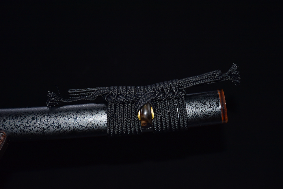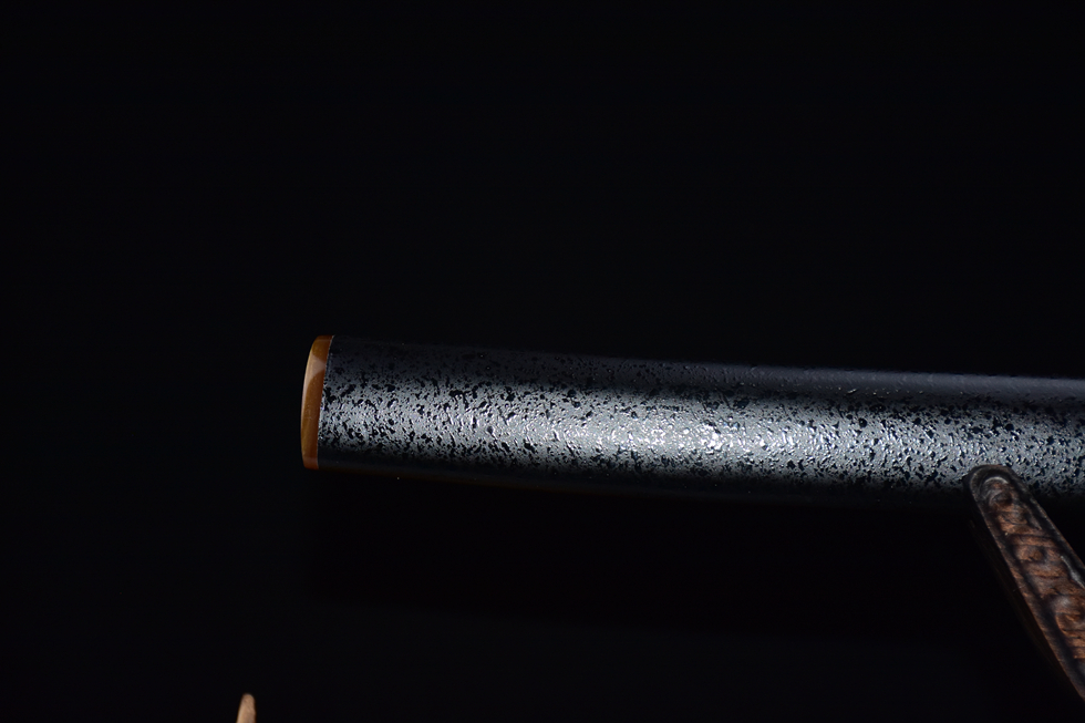 Vỏ kiếm: Gỗ tự nhiên phủ sơn kiểu "mưa rơi" (雨点鞘) độc đáo, viền miệng gắn sừng bò thật chống nứt vỡ, tăng độ bền và thẩm mỹ