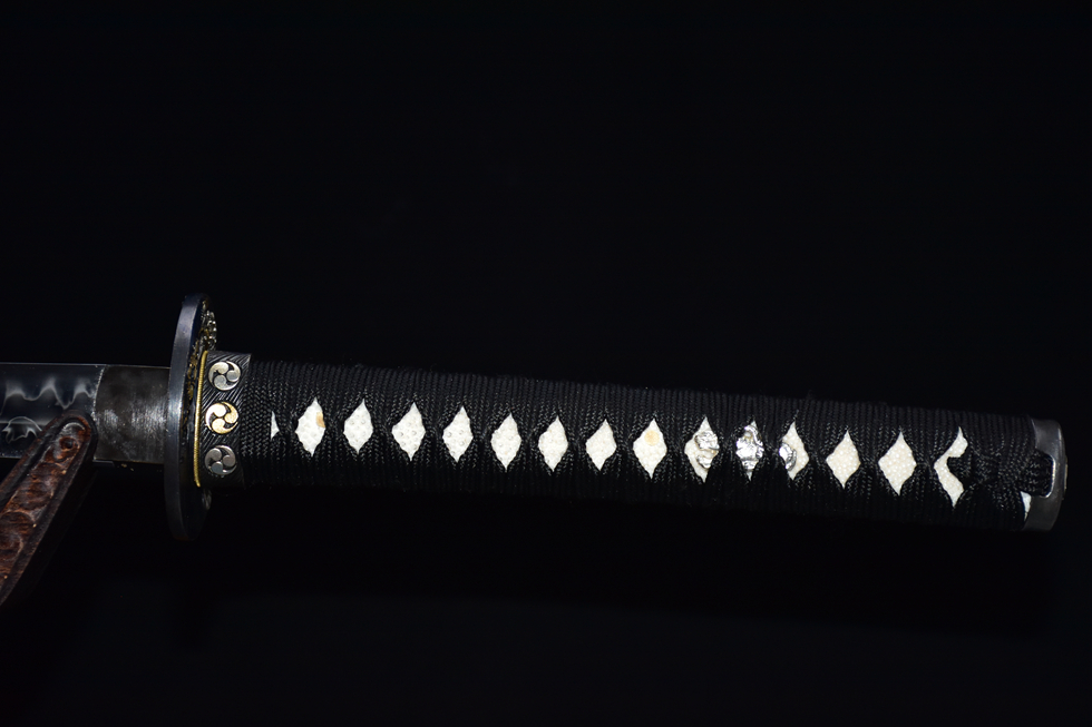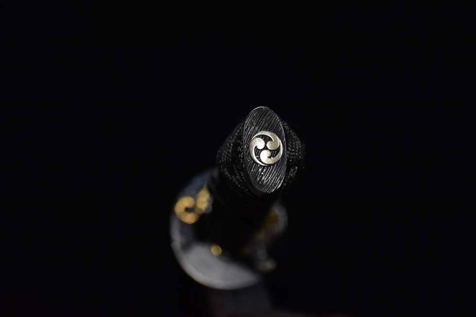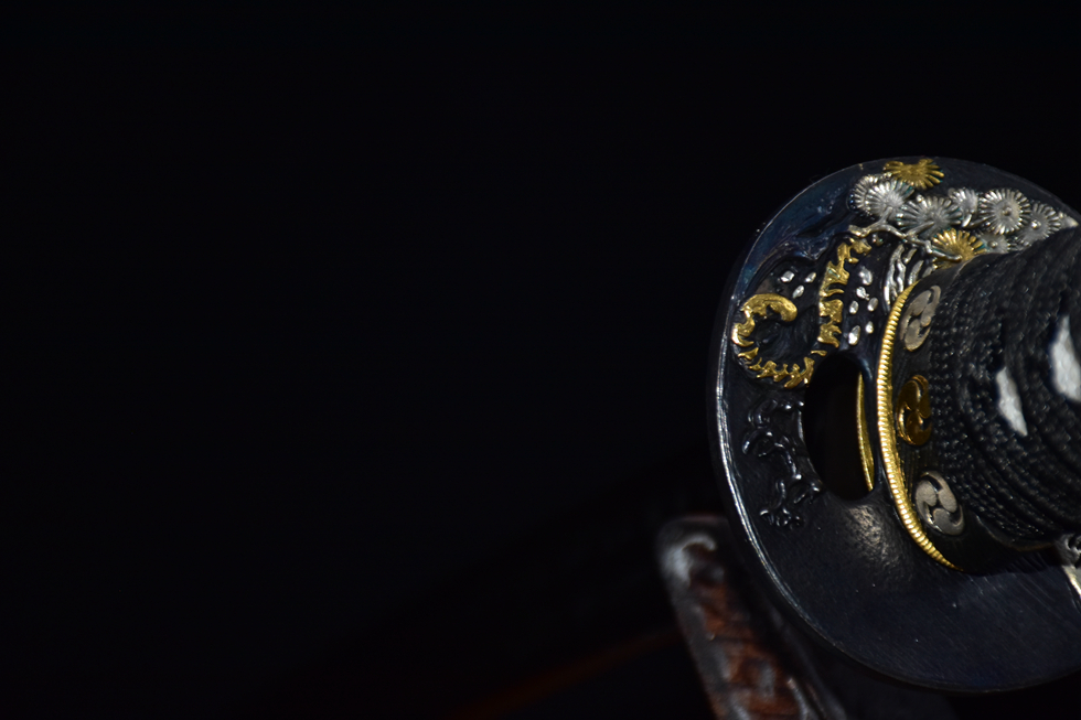 Bộ phụ kiện (tsuba, fuchi, kashira): Đồng nguyên khối chạm khắc thủ công, kết hợp mạ ba màu: vàng cổ, bạc, đồng cổ, thể hiện vẻ mạnh mẽ và hoài cổ