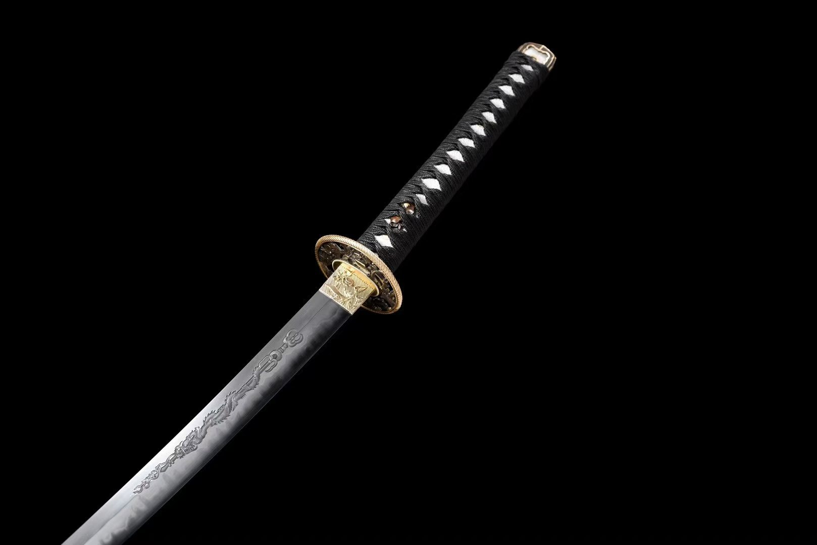 - Lưỡi kiếm: Thép T10, tôi lưỡi đắp đất, mài 18 công đoạn, đánh bóng gương