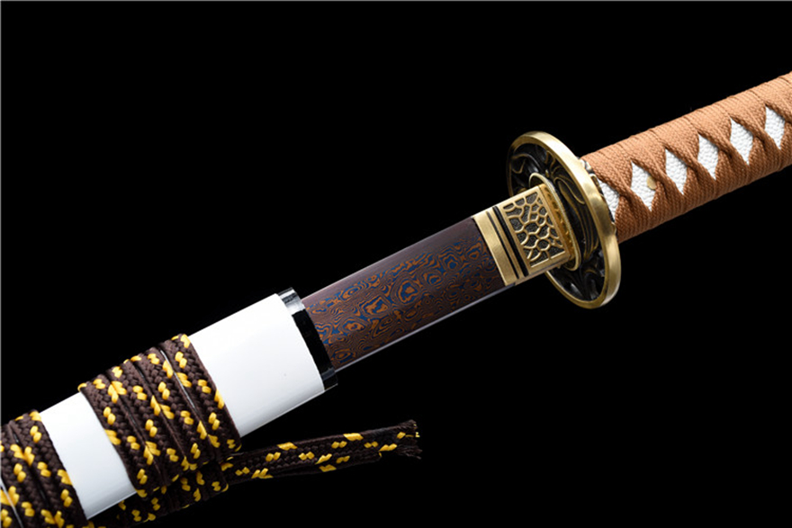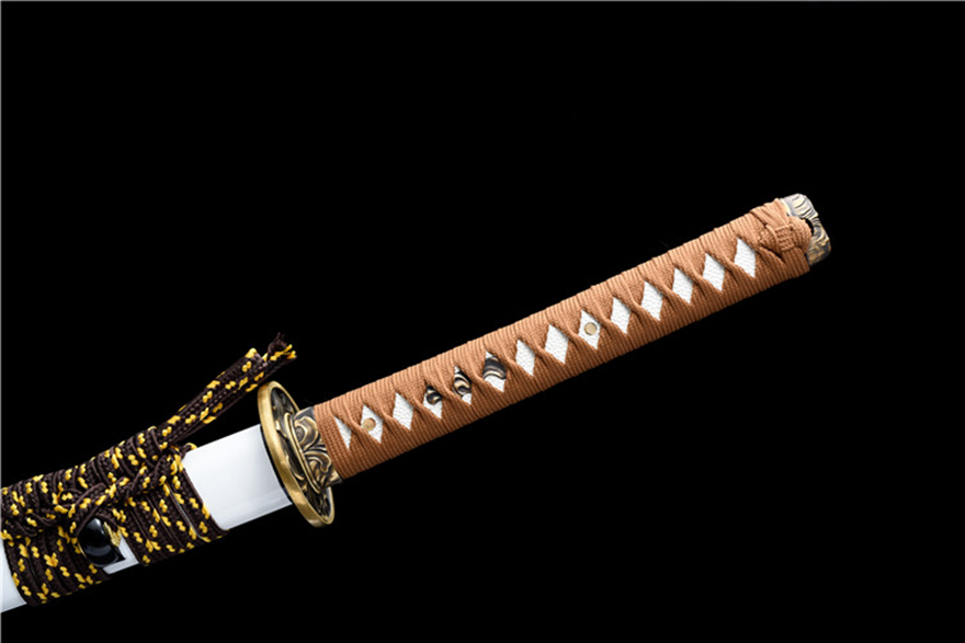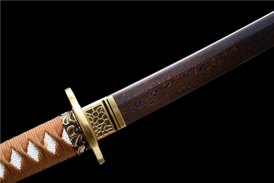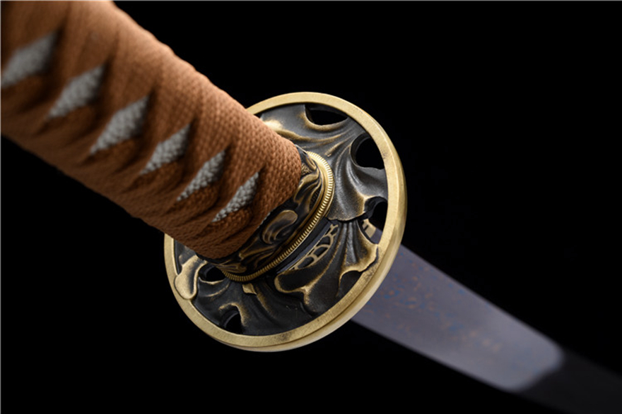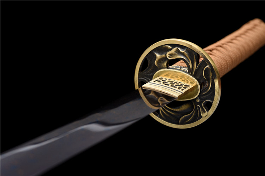 Chi tiết tinh xảo: Phần bảo vệ (Tsuba) làm bằng đồng nguyên chất, được chạm khắc họa tiết hoa văn tinh tế, tăng thêm giá trị thẩm mỹ và sang trọng cho thanh kiếm.