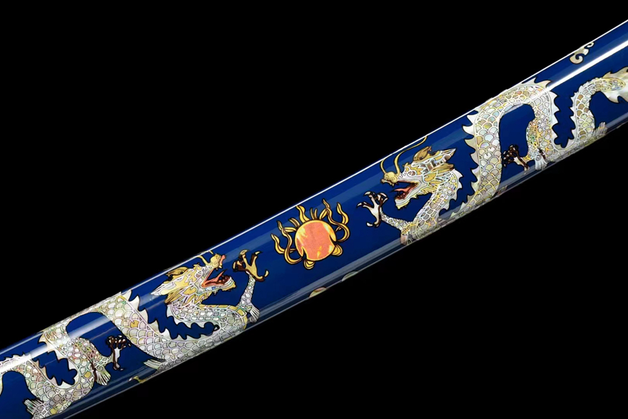 Vỏ kiếm làm từ gỗ thực sơn mài, giả vỏ sò cao cấp, phối cùng dây thô bản to kiểu Nhật tăng thêm phần sang trọng.