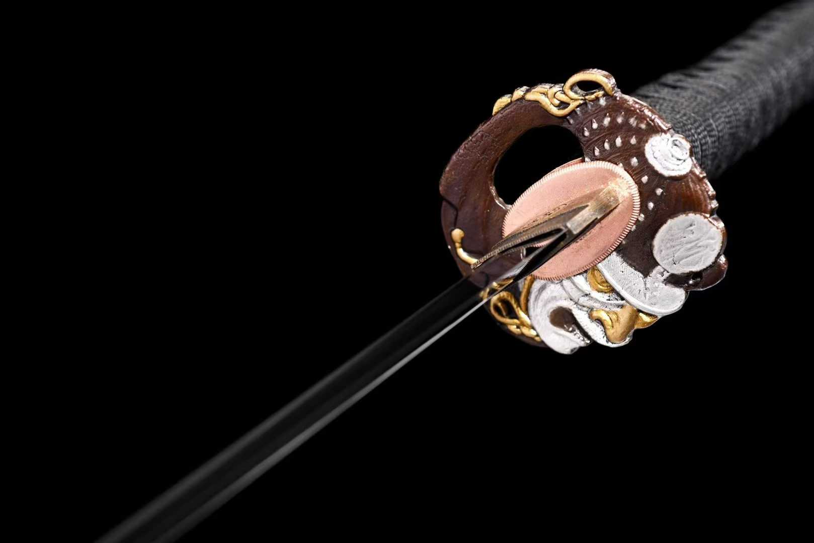 Tsuba và phụ kiện: Bộ phụ kiện bằng đồng nguyên khối mạ vàng và bạc, chạm khắc tinh xảo, mang giá trị thẩm mỹ cao.