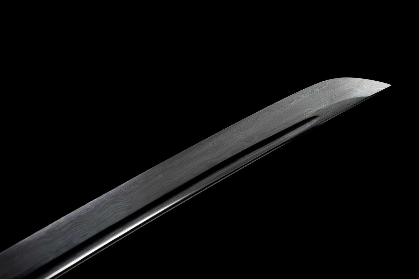 Lưỡi kiếm được chế tác từ thép hoa văn bách luyện, rèn thủ công với độ cứng đạt 60 HRC, có thể uốn cong 90 độ rồi bật về nguyên trạng mà không biến dạng – kết hợp hoàn hảo giữa độ bền và tính linh hoạt.