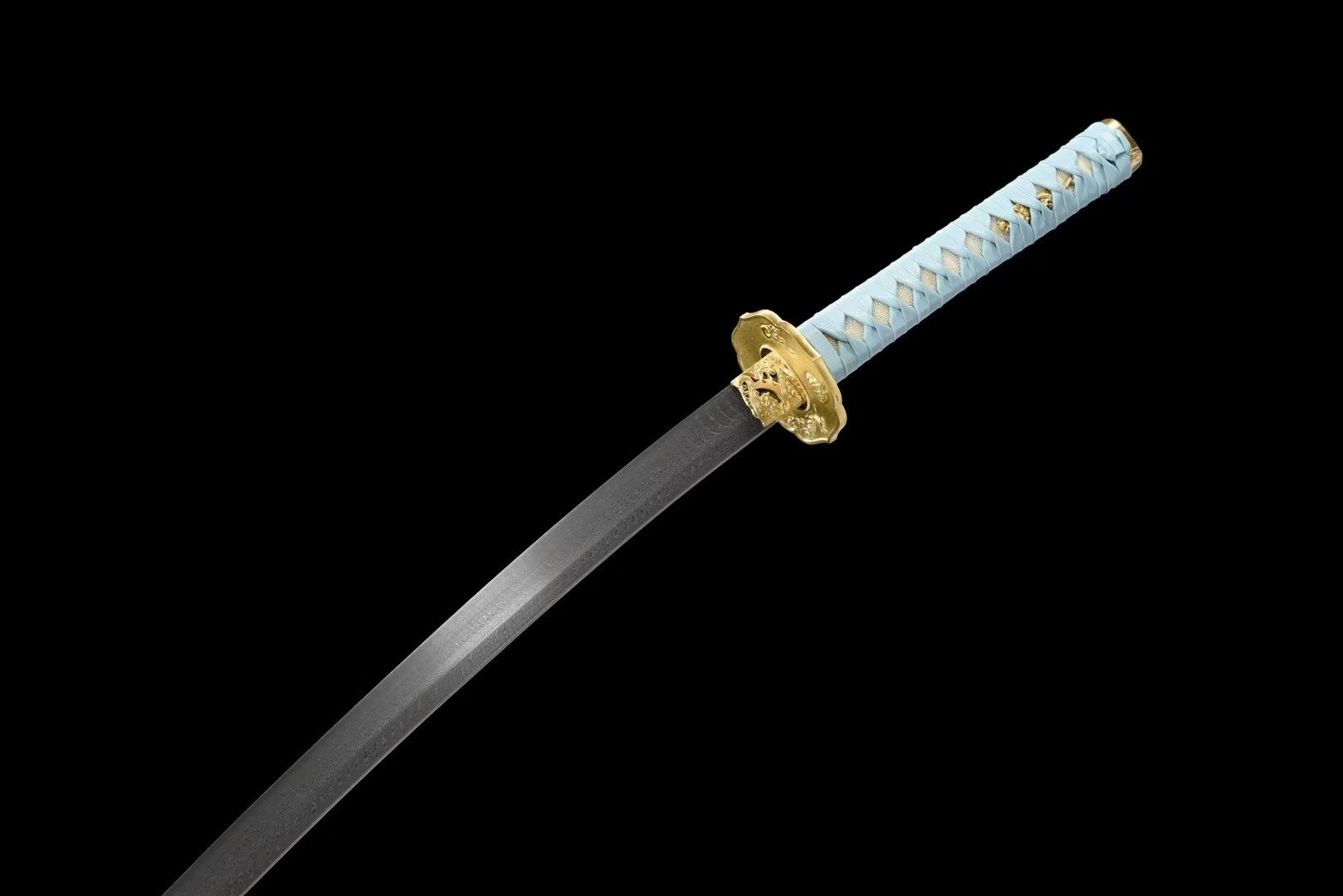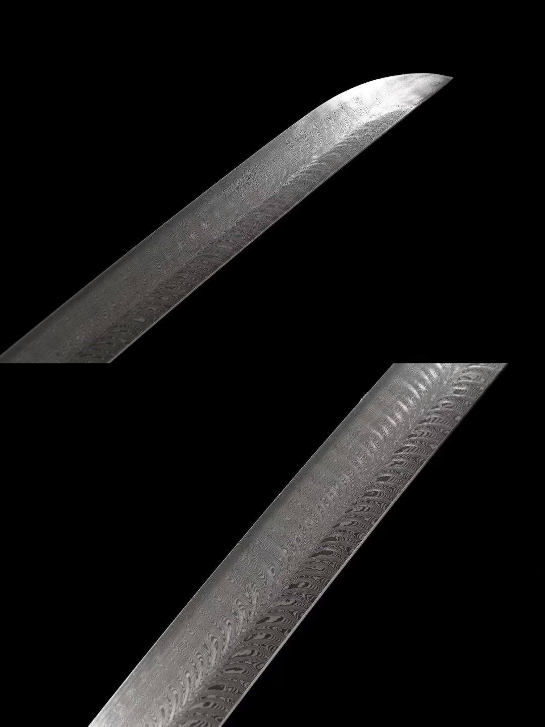 Lưỡi kiếm được chế tác từ thép Damascus, trải qua quá trình gấp, xoắn và kéo giãn nhiều lần, tạo nên vân thép tự nhiên đặc trưng. Toàn bộ lưỡi được mài thủ công 18 công đoạn, mang lại độ sắc bén cao và sự cân bằng hoàn hảo giữa độ cứng và độ dẻo.