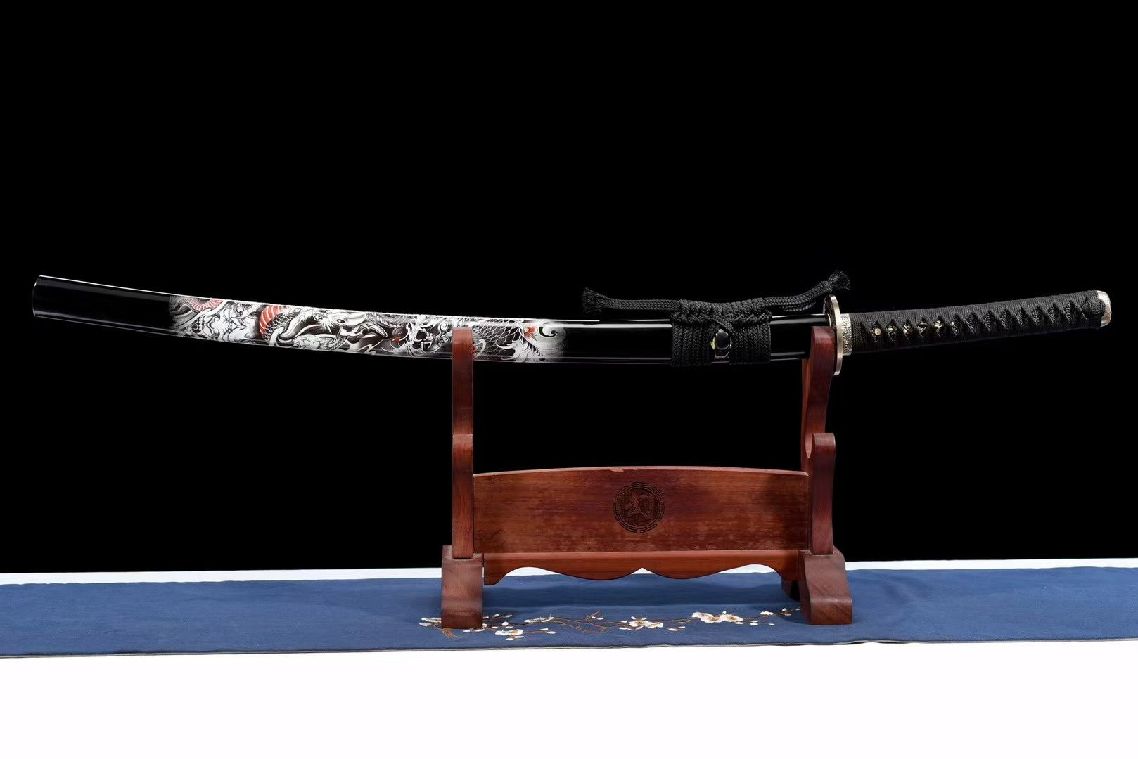 - Vỏ kiếm (Saya): Gỗ tự nhiên sơn mài, trang trí họa tiết thủ công