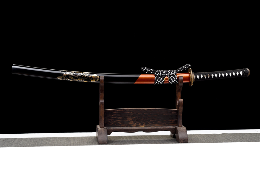 Vỏ kiếm: Làm từ gỗ cao sơn tự nhiên, phủ sơn mài đen bóng sang trọng, vừa bền vừa đẹp.
