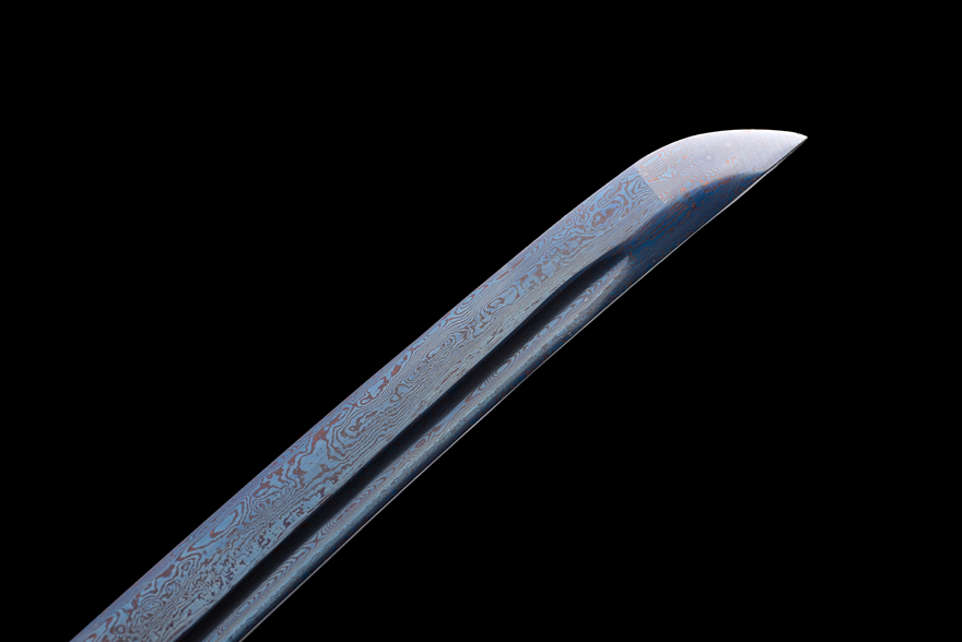 Chất liệu lưỡi: Lưỡi kiếm được chế tác từ thép gấp vân hoa (百炼折叠花纹钢) – loại thép cao cấp nổi bật với vân rèn nghệ thuật, độ bền cực cao và khả năng giữ cạnh sắc bén lâu dài.