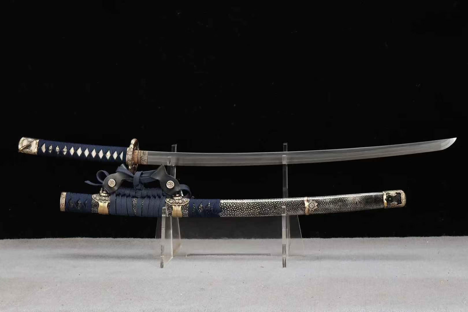 Kiếm Nhật Tachi Ô Từ Damascus 26 Inch – Thép Đại Mã Ô Từ, Phủ Đất Tôi Lưỡi, Da Cá Đuối Cao Cấp