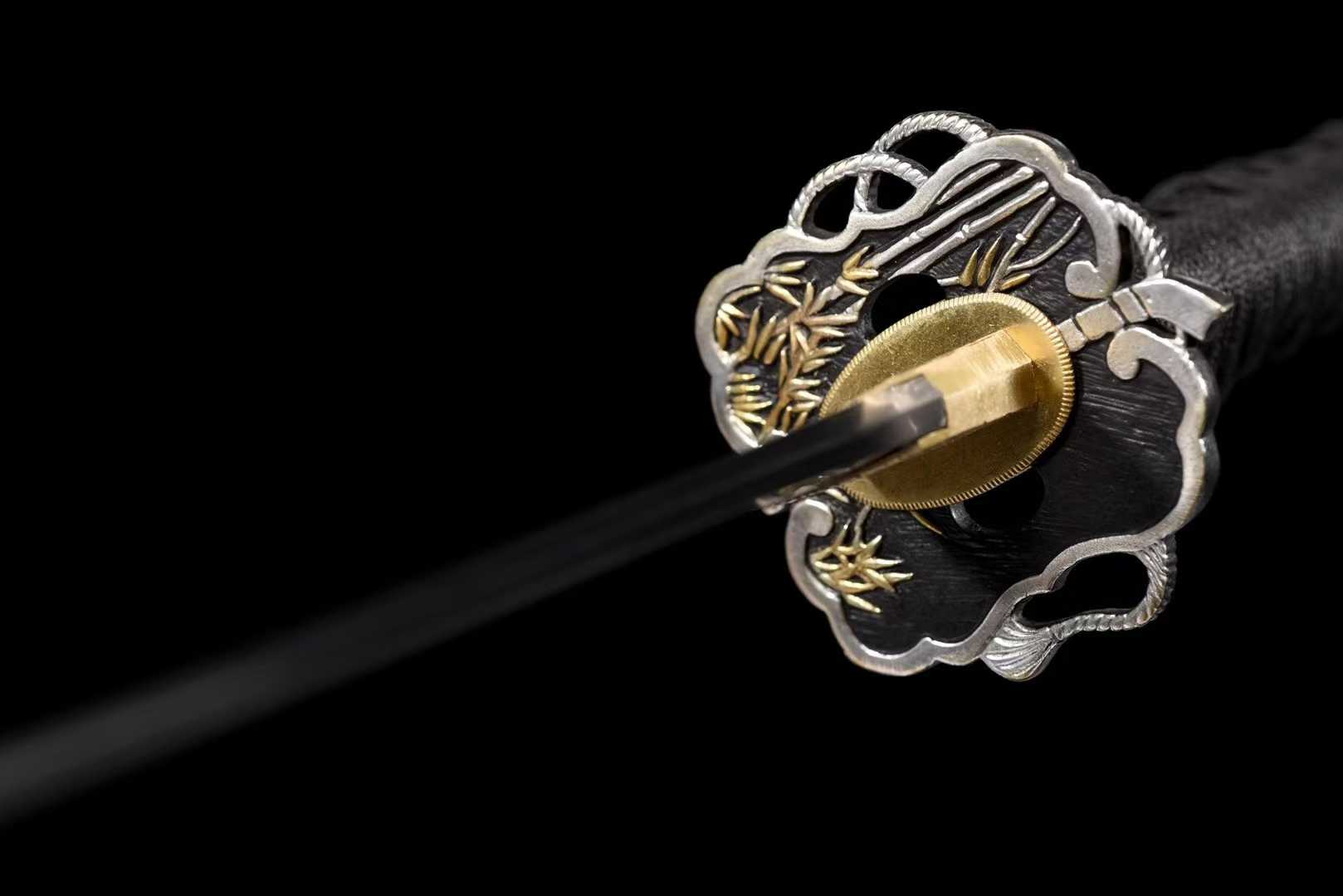 Vỏ kiếm gỗ sơn mài đen có điểm hoa văn bạc: Mang nét truyền thống tinh tế, kèm dây thô chủ đạo đầy phong cách.