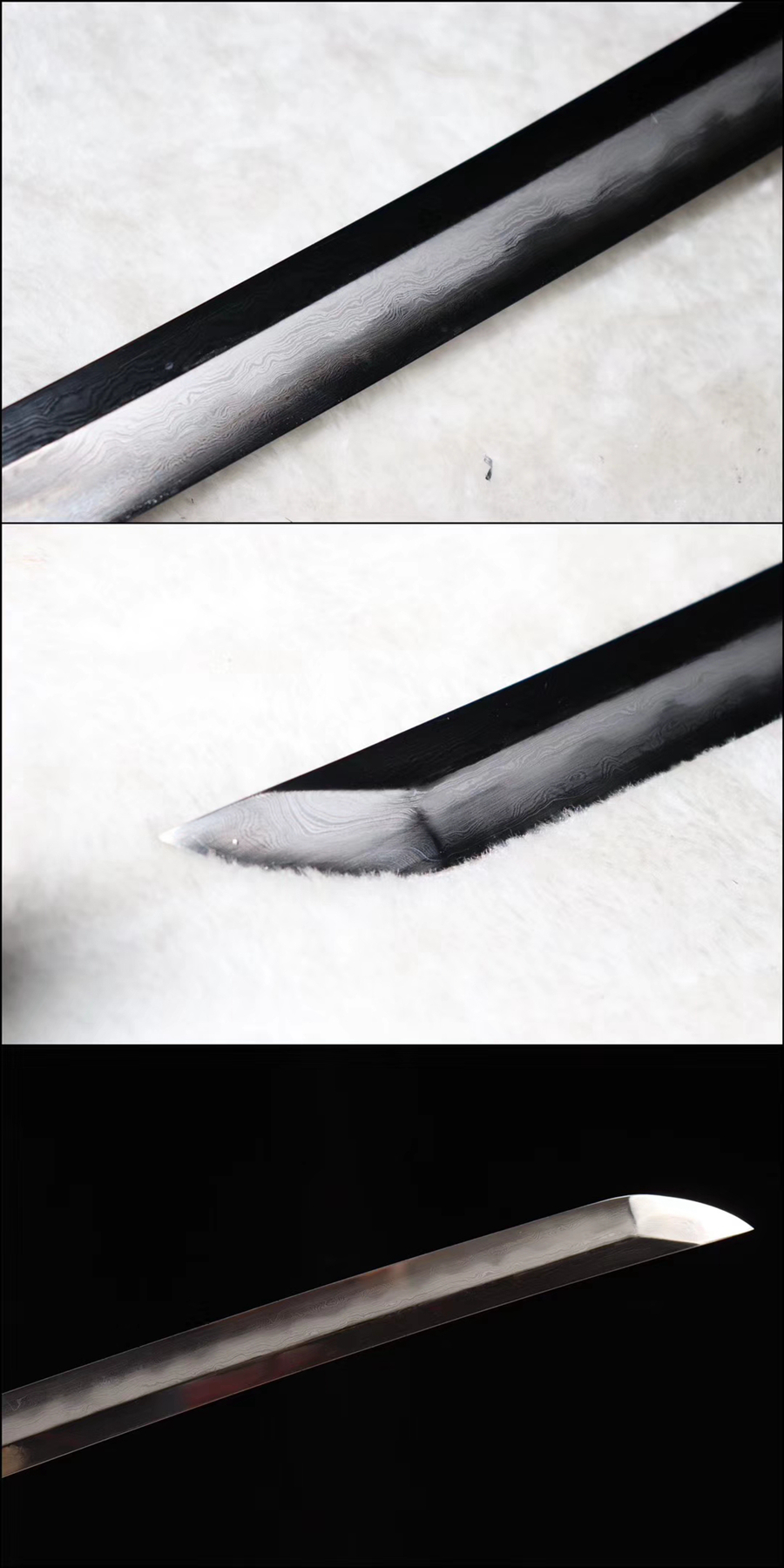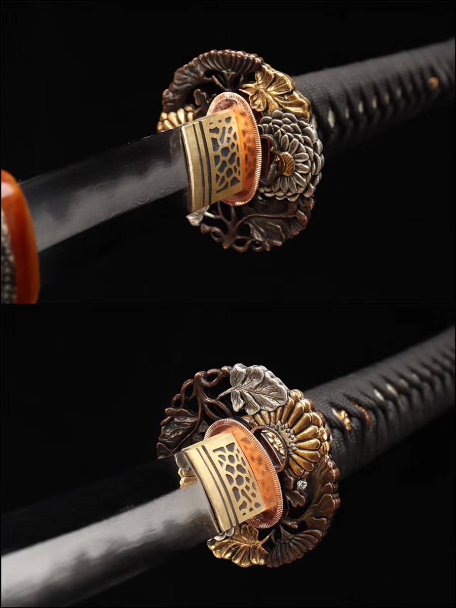 Thép: Sử dụng thép bách luyện (folded steel) – rèn bằng đất sét truyền thống, tạo đường vân Hamon đẹp mắt và rõ nét.