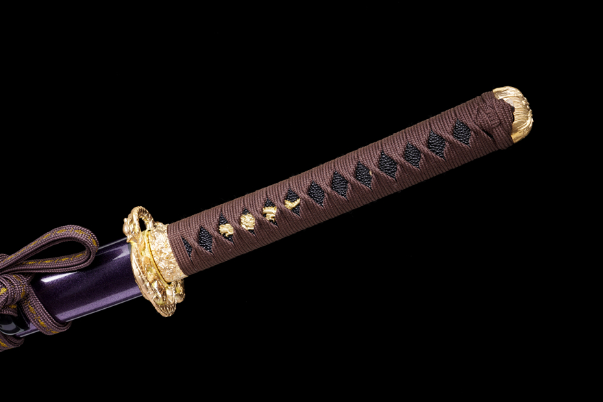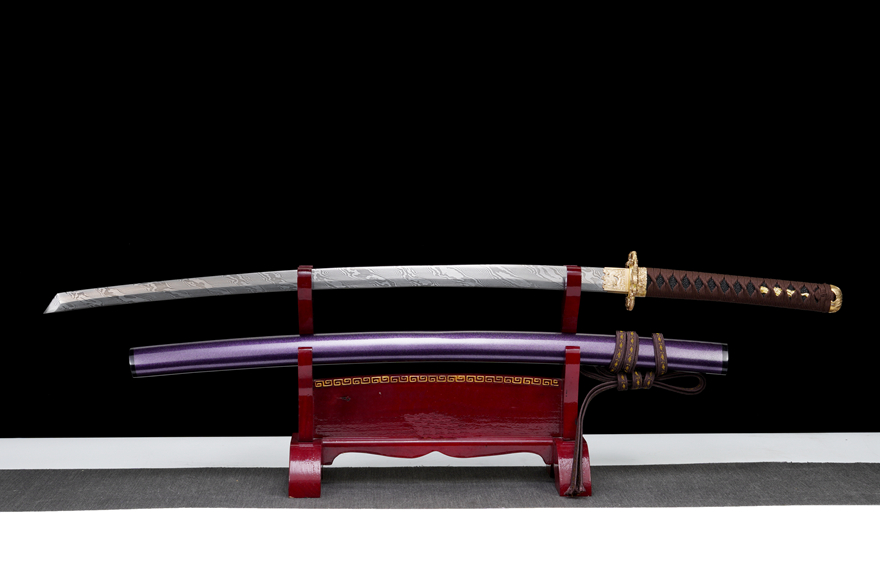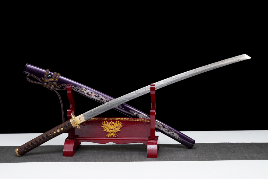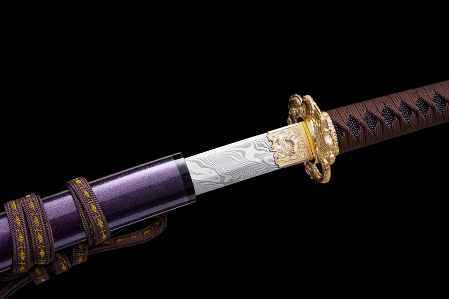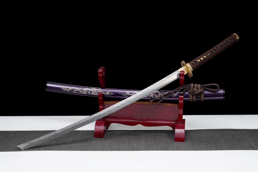 Kiếm Nhật “Tử Thanh Thần Long” – Thép Hoa Văn Xoắn Damas, Đồng Nguyên Chất Khắc Rồng