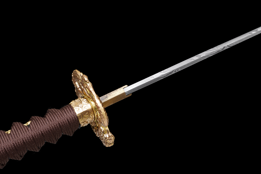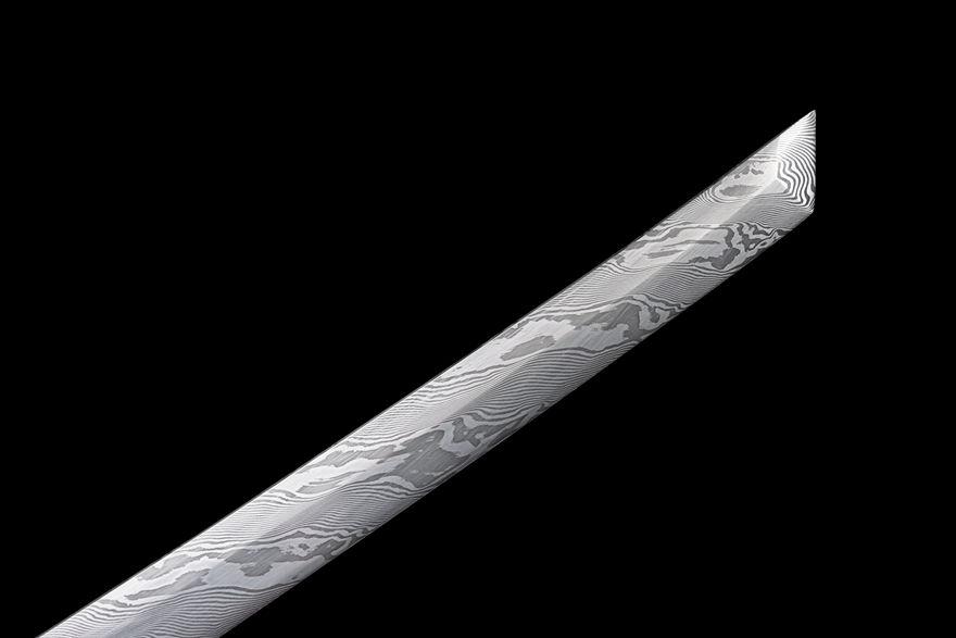 Lưỡi kiếm: Rèn thủ công từ thép hoa văn gấp lớp (tự luyện), tạo vân Damascus xoắn (大马纹) độc đáo.