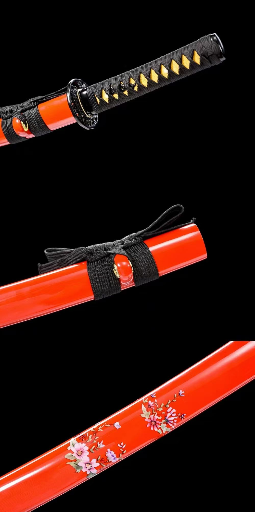 - Vỏ dao (Saya): Gỗ tự nhiên sơn mài, trang trí họa tiết hoa tinh tế