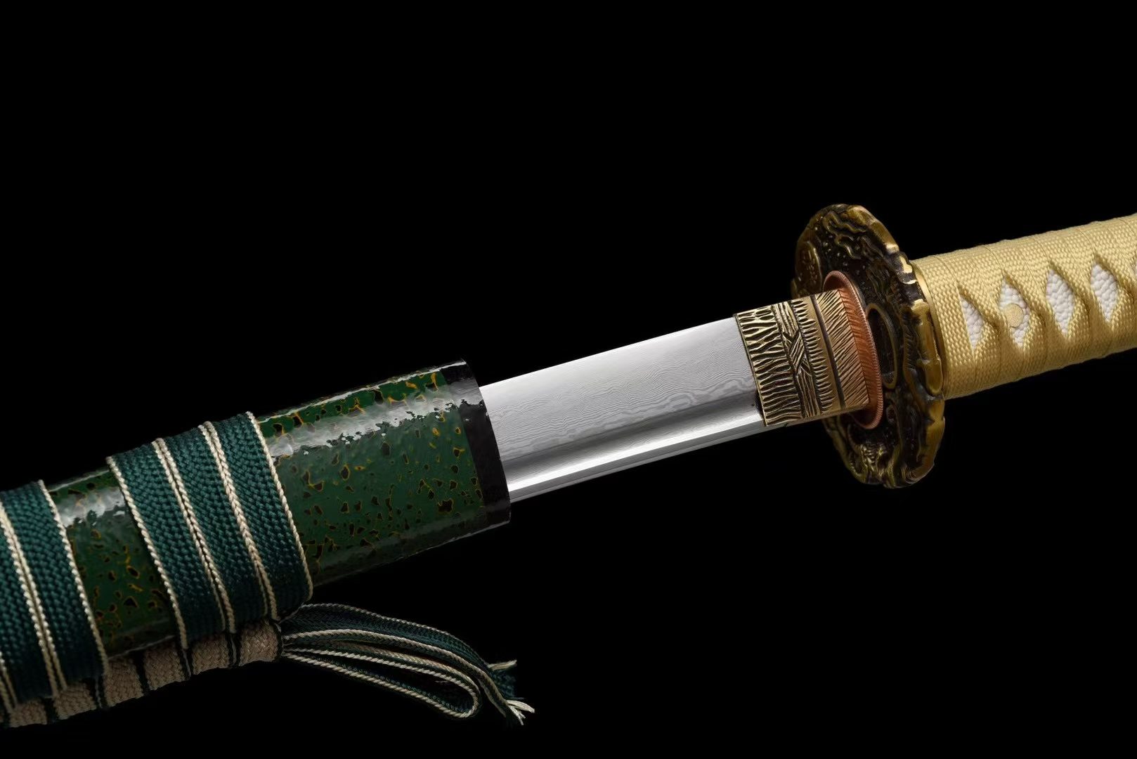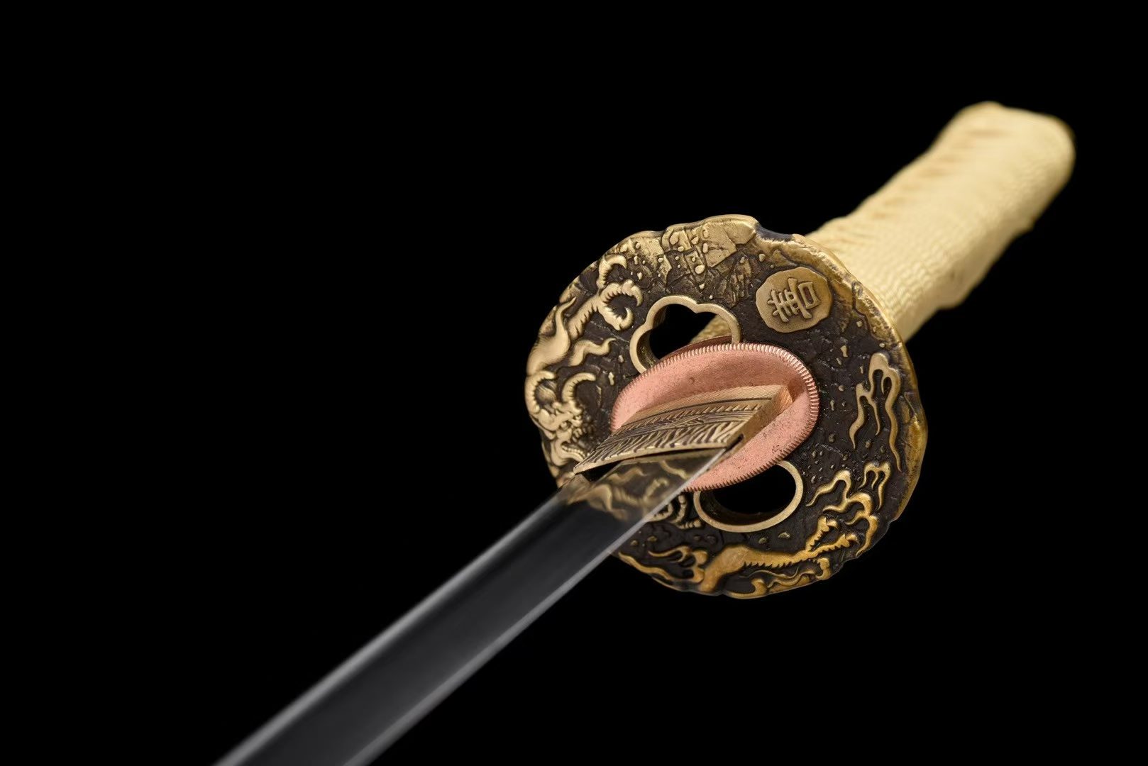 - Lưỡi kiếm: Thép hoa văn bách luyện, vân gấp tự nhiên
