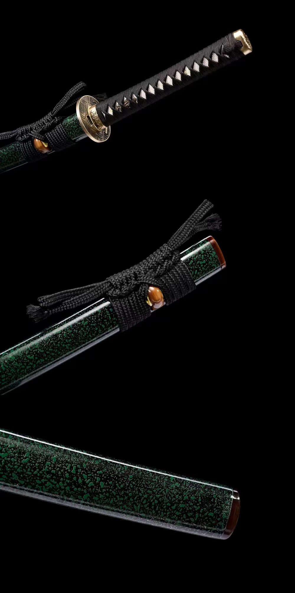 - Vỏ kiếm (Saya): Sơn mài màu xanh cao cấp, các chi tiết (miệng vỏ, chốt, điểm treo) được khảm sừng trâu tự nhiên
