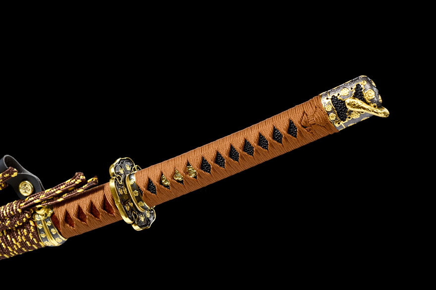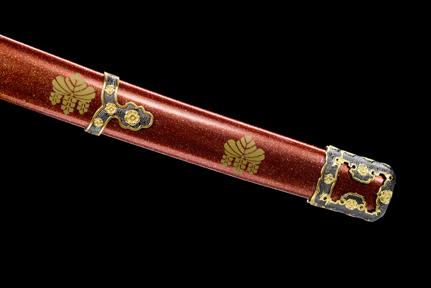 Vỏ kiếm làm từ gỗ sơn mài đỏ ánh vàng cao cấp (红洒金大漆鞘), kết hợp với dây quấn cán thô tinh tế (粗下绪) tạo nên nét sang trọng và đậm chất truyền thống Nhật Bản.