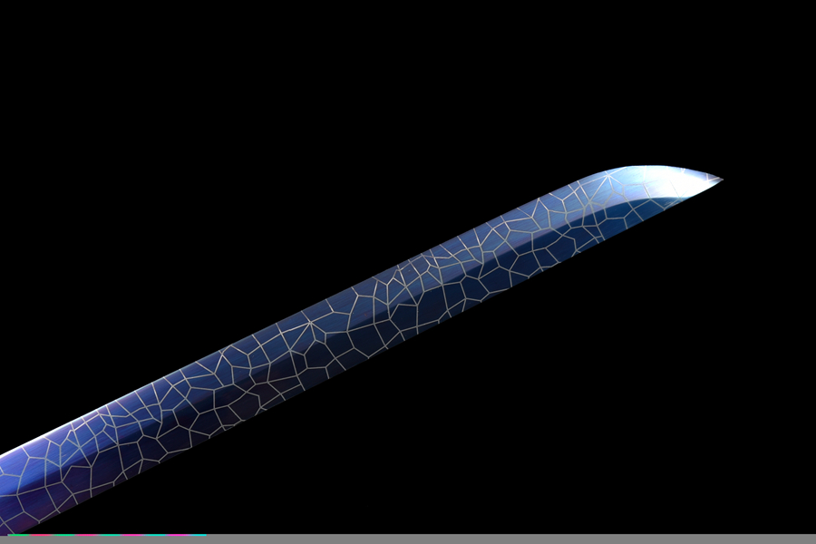 Lưỡi đao được rèn từ thép đàn hồi (thép lò xo), ứng dụng công nghệ nướng xanh (bluing) tạo hiệu ứng ánh màu đặc trưng trên bề mặt thép.
