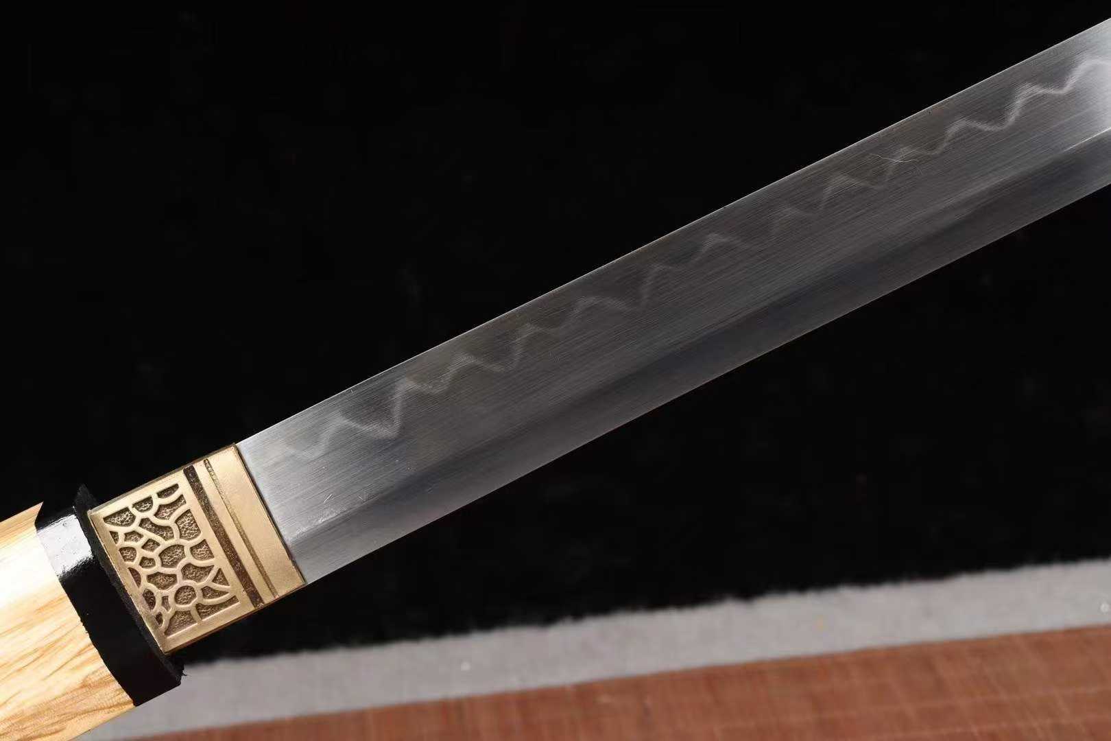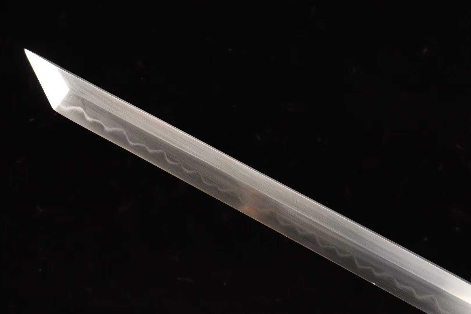 Lưỡi kiếm được rèn từ thép công cụ T10 carbon cao cấp, theo phương pháp phủ đất tôi cháy (覆土烧刃) truyền thống Long Tuyền, nung ở nhiệt độ 1200°C, rồi tôi dầu – nước kết hợp, giúp tạo nên vân cháy rõ ràng, sống động, độ cứng đạt 60 HRC mà vẫn đàn hồi tốt — cứng mà không giòn, dẻo mà không yếu, đúng tinh thần “cương nhu tương sinh, nhất đao lưỡng thế giới”.